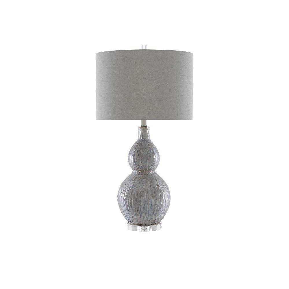 The gourd shape of our Idyll Table Lamp has been realized in porcelain. The striated surface in gray, blue, and taupe tones is texturally rich. The gray lamp sits atop a clear optic crystal base and is fitted with a gray shade.