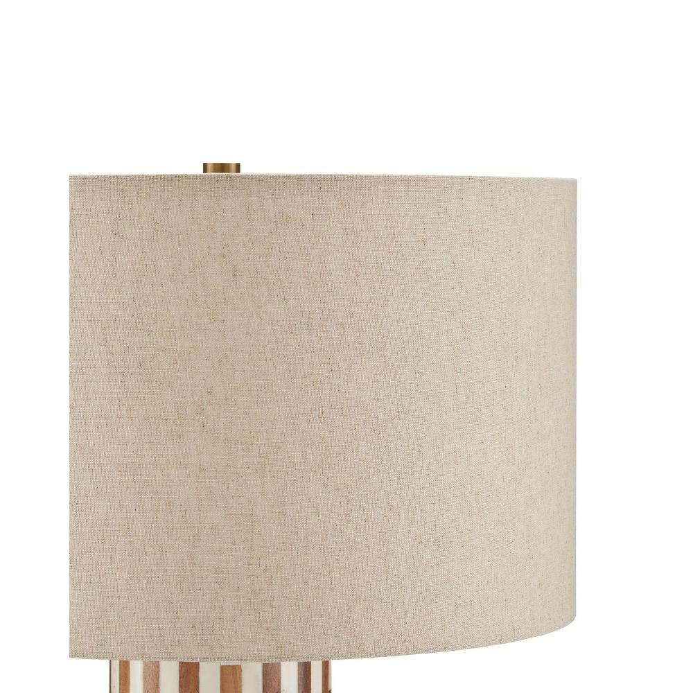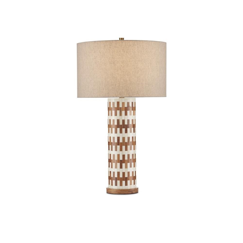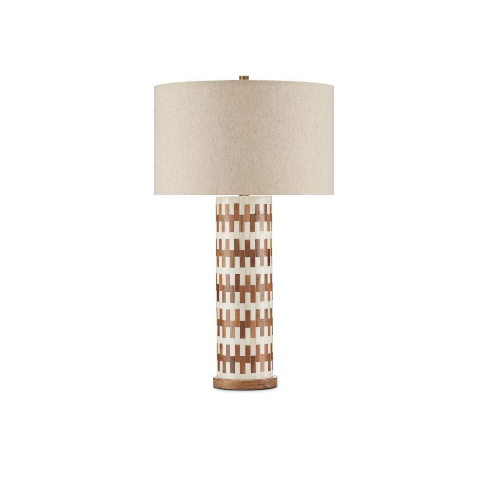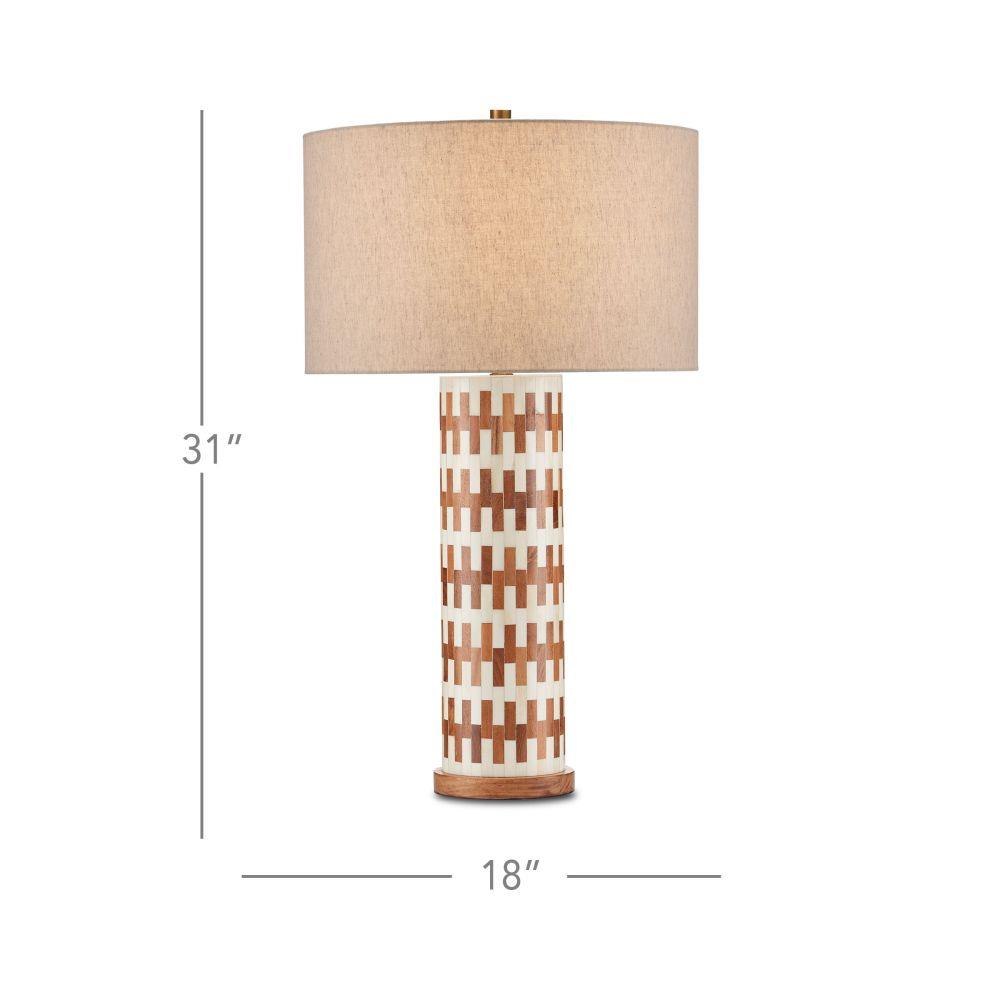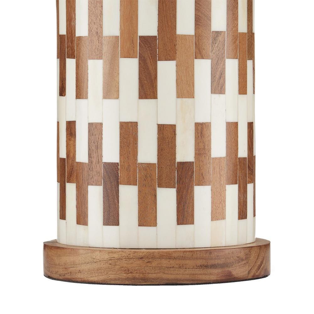 The Tia Table Lamp has a columnar body covered in an off-set brick pattern running along its circumference that is made of white bone and wood to bring the ivory and brown table lamp a refined sense of movement. The base in a matching wood is a pared-down element to keep the overall design simple. Adding to the warmth of the piece, which was designed by Aimee Kurzner, is the natural linen shade and the antique brass hardware and finial.