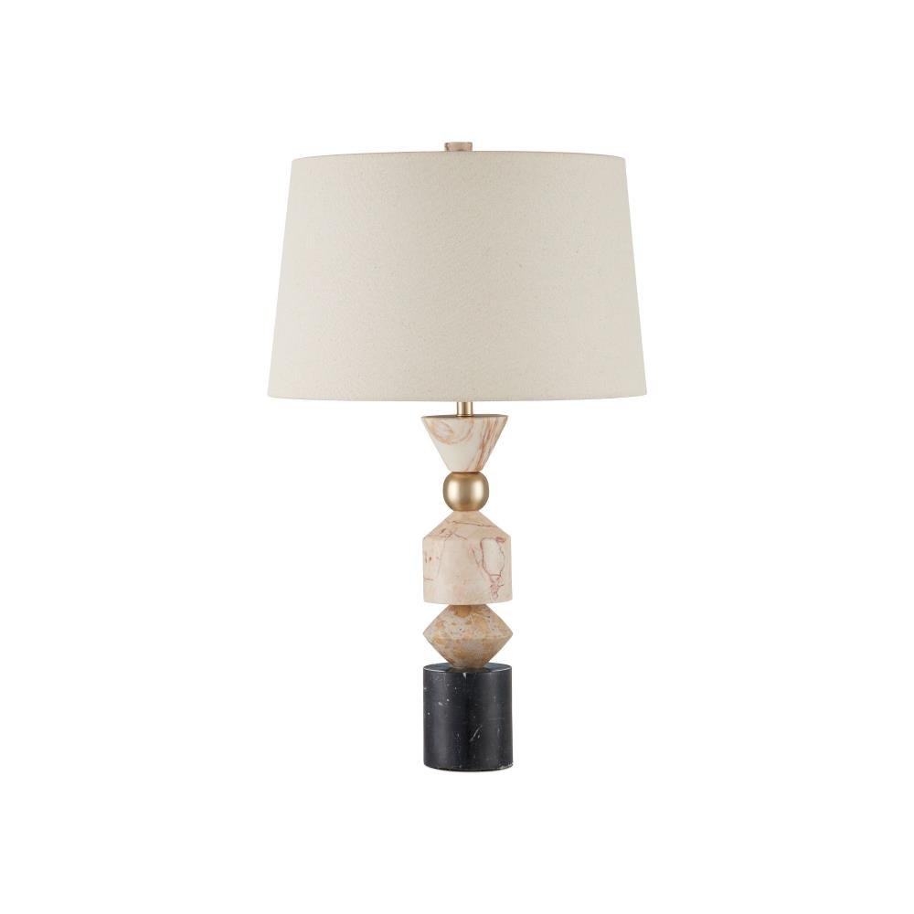 The Seguso Table Lamp is made of a stack of geometric forms crafted from a mix of richly veined natural stones—black Marquina marble, fossil beige marble, Tennessee pink marble, and golden Calcutta marble. A single gleaming golden metal orb adds a sleek accent to the composition, enhancing the contrast of textures and tones. With a profile reminiscent of a modern chess piece, this black and beige lamp is both sculptural and sophisticated.