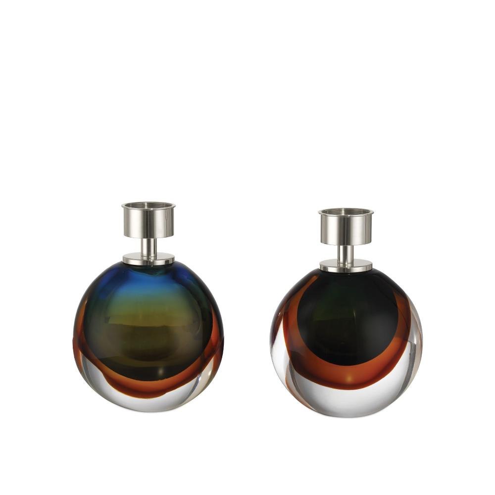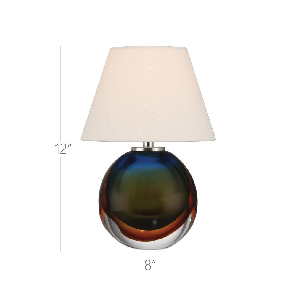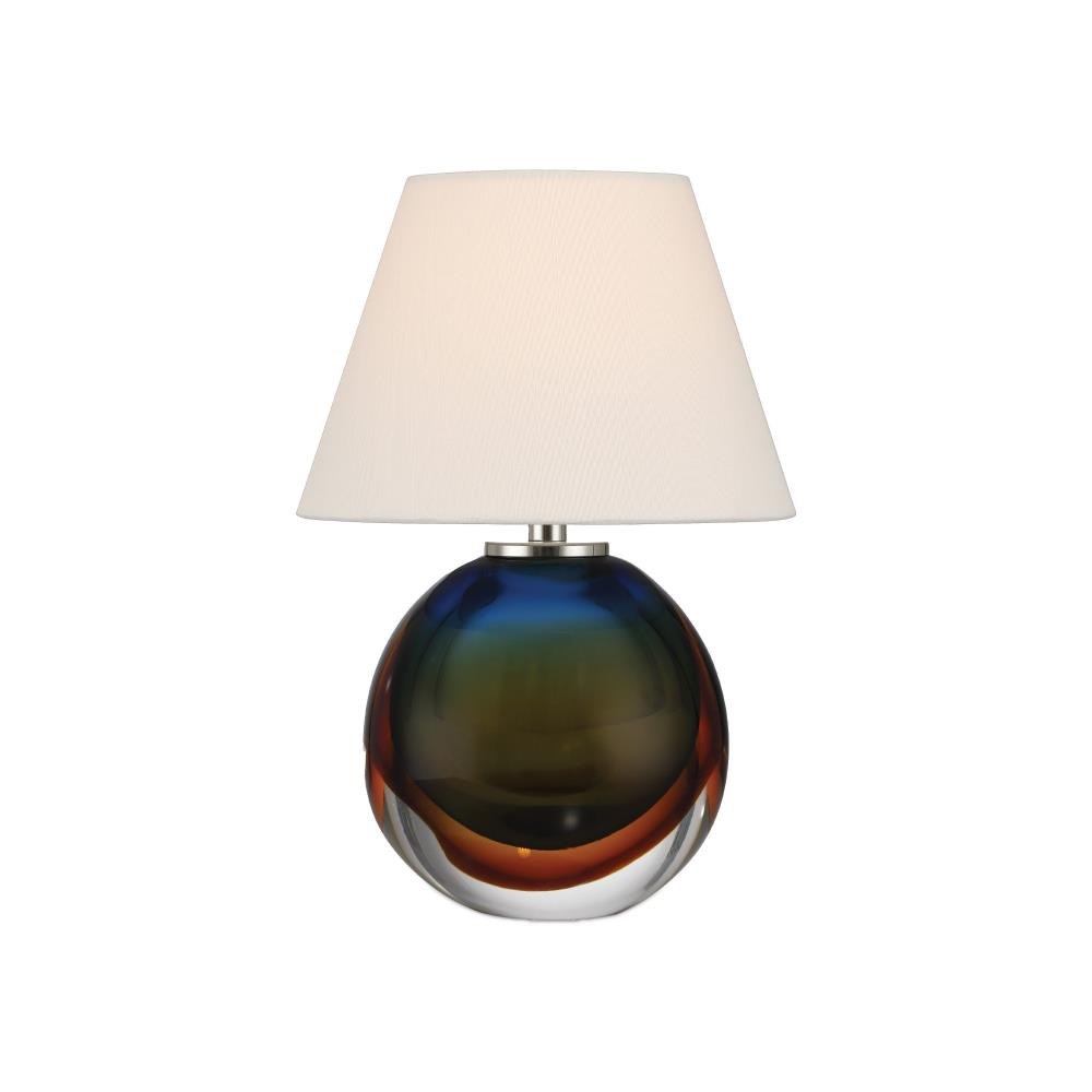The Voyage Nickel Cordless Table Lamp is a luminous art-glass piece crafted through a layered glassblowing process—blue glass is first gathered and blown, followed by amber, then finished with a layer of clear to create its smooth orb shape. The blending of colors produces a subtle green effervescence at the center, giving the lamp depth and dimension. Topped with a fabric shade and polished nickel hardware, this rechargeable, cordless design offers both portability and artistry in a compact, glowing form.