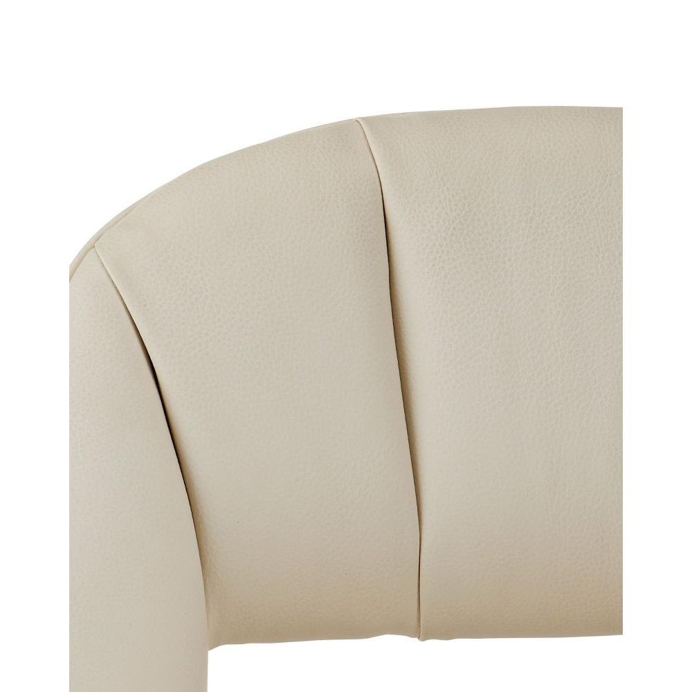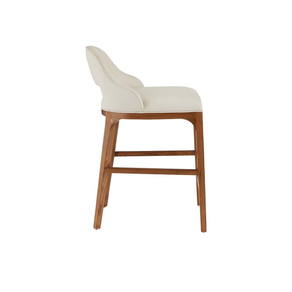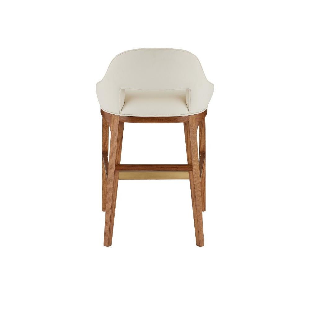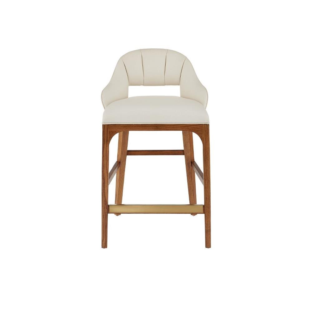 The Inga Counter Stool, covered in Endurance Sand fabric, has an upholstered back and seat that sits nimbly atop a solid white-oak frame in a morel brown finish. The paleness of the fabric and the warmth of the wood are contrasting elements. A brass kick plate on the front rung in a brushed brass finish serves a purpose and brings a bit of brightness to the design by Aimee Kurzner.