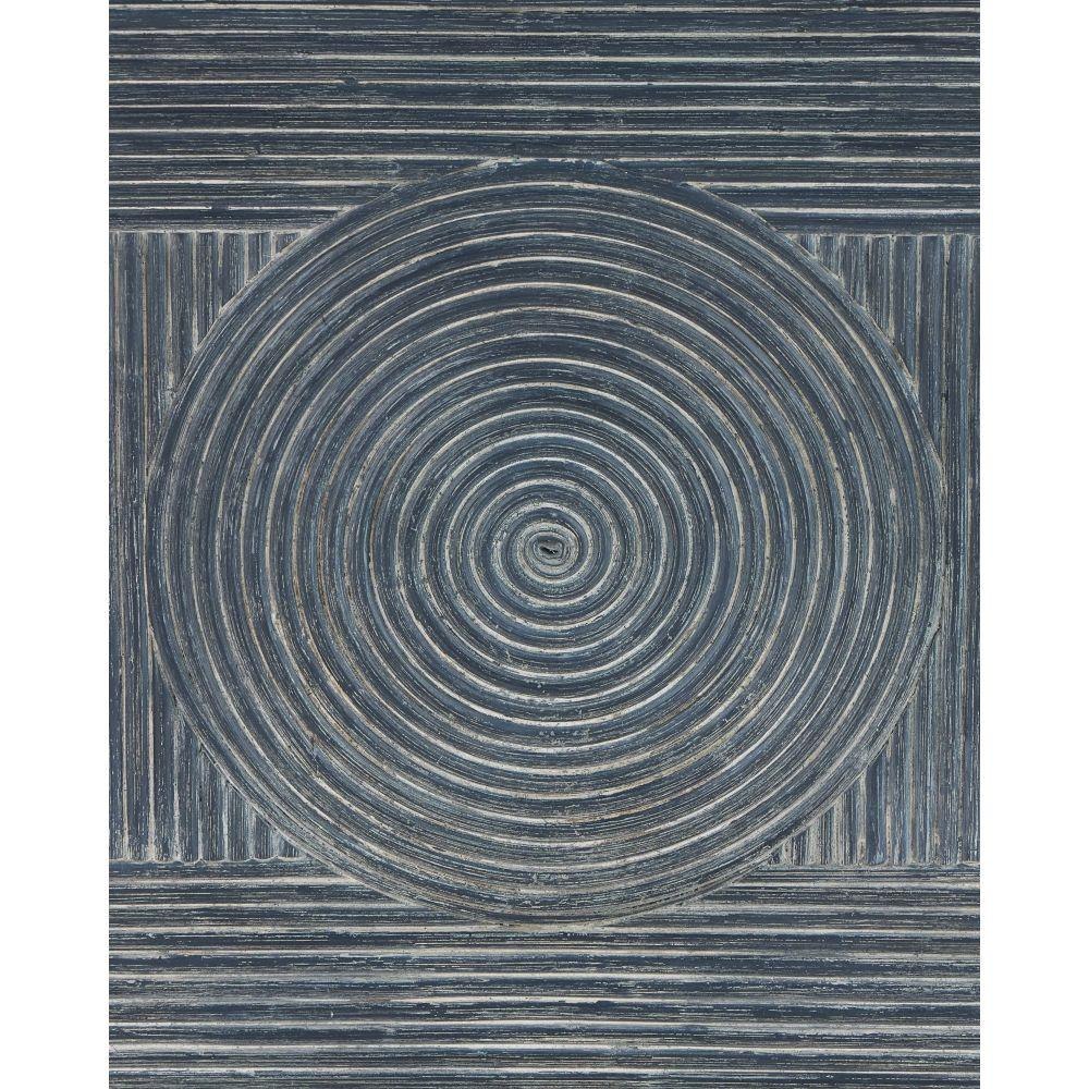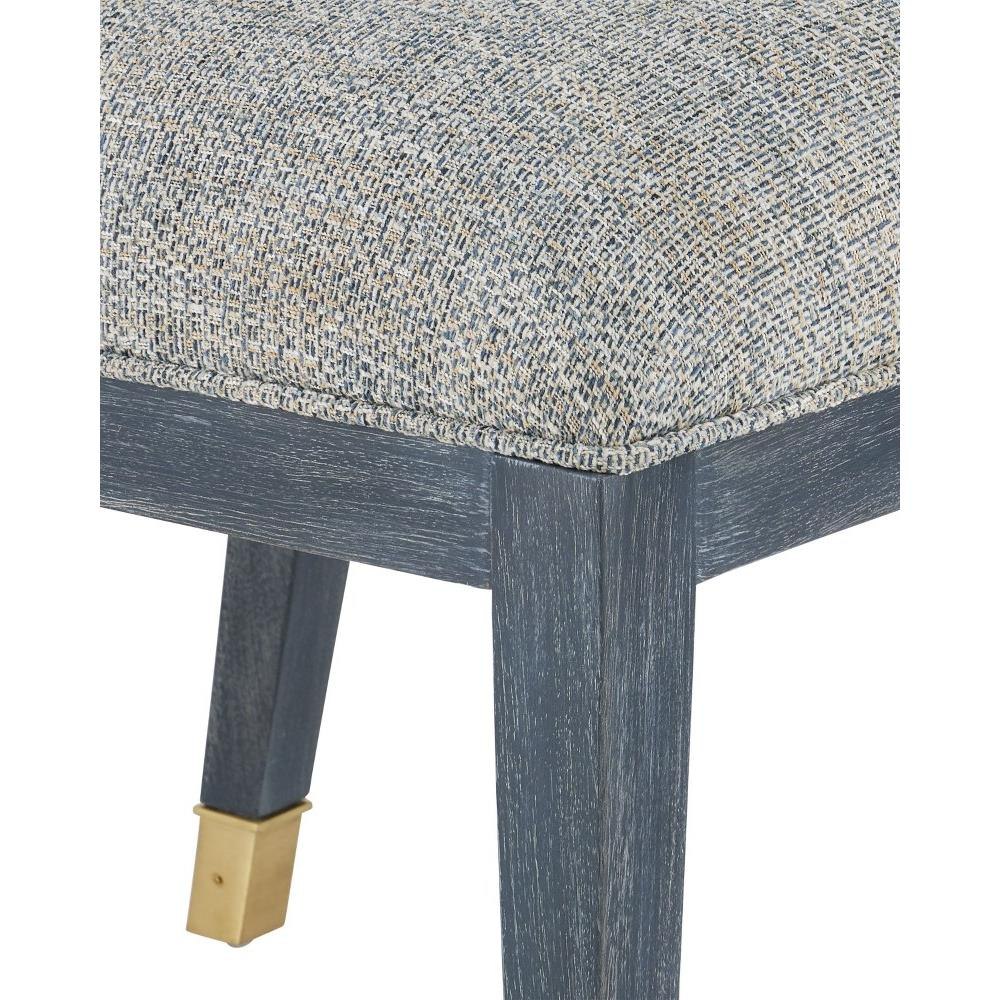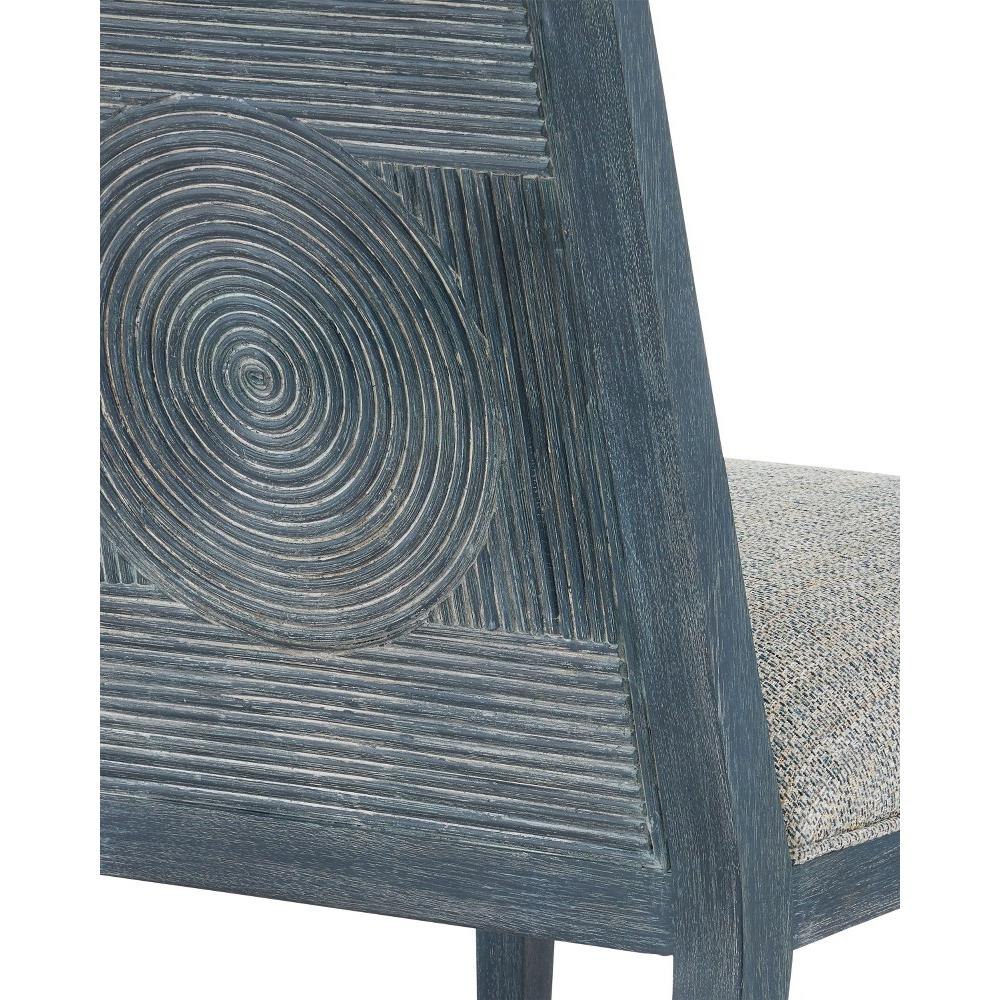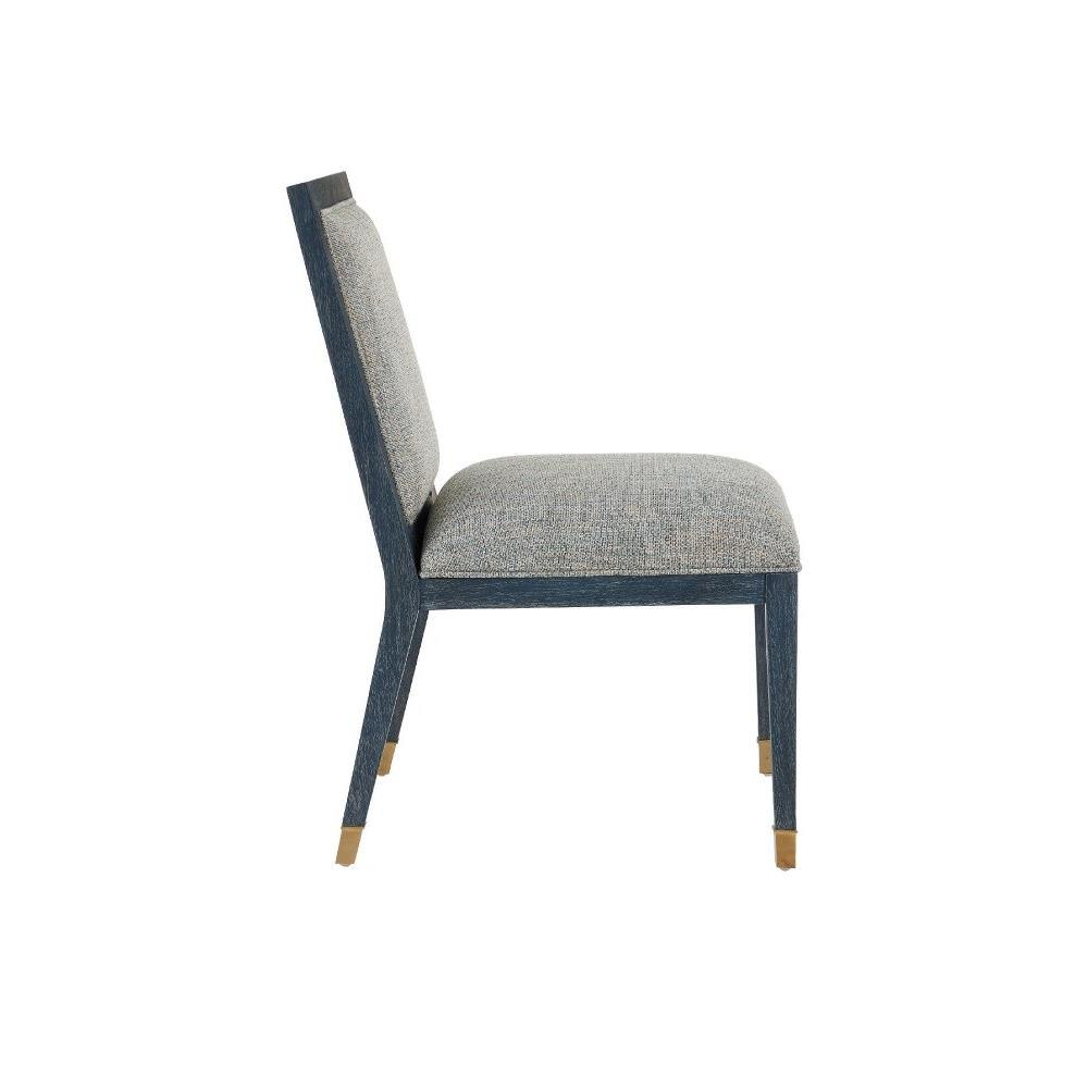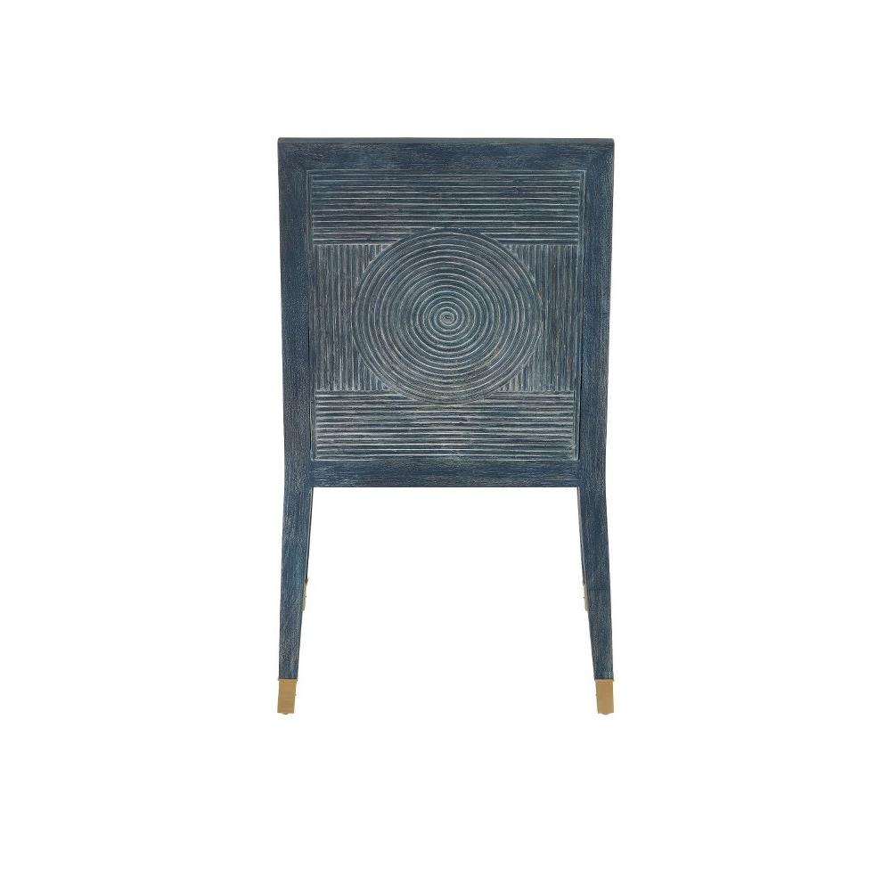 The Santos Vintage Navy Side Chair has a split rattan pattern on the back, which is made by hand and applied to a solid mahogany frame. Once the natural material is in place, a vintage navy finish covers the back, frame, and legs. The blue dining chair is upholstered in a Barrett Dusk material. The chair has brass ferrules to add sophistication to the overall design.