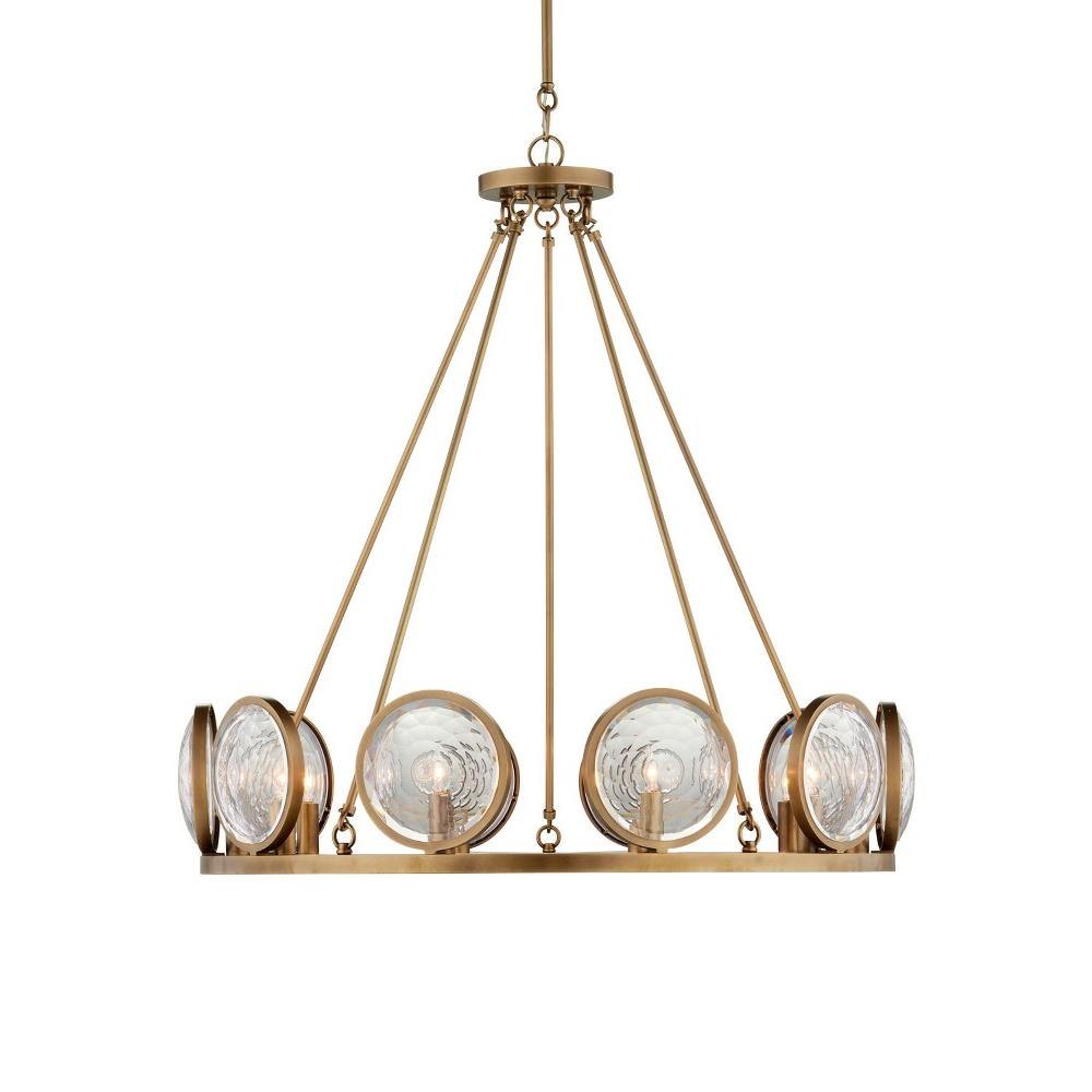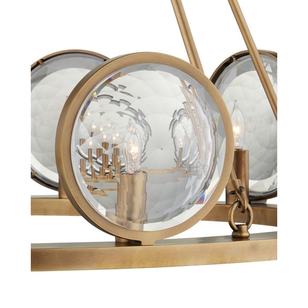 With concentric circles of faceted glass framed by metal in an antique brass finish, the MarjieScope chandelier diffuses its light through its optic crystal prisms. This gold chandelier that exudes warm tones is in our Marjorie Skouras Collection. We also offer the MarjieScope in a wall sconce.