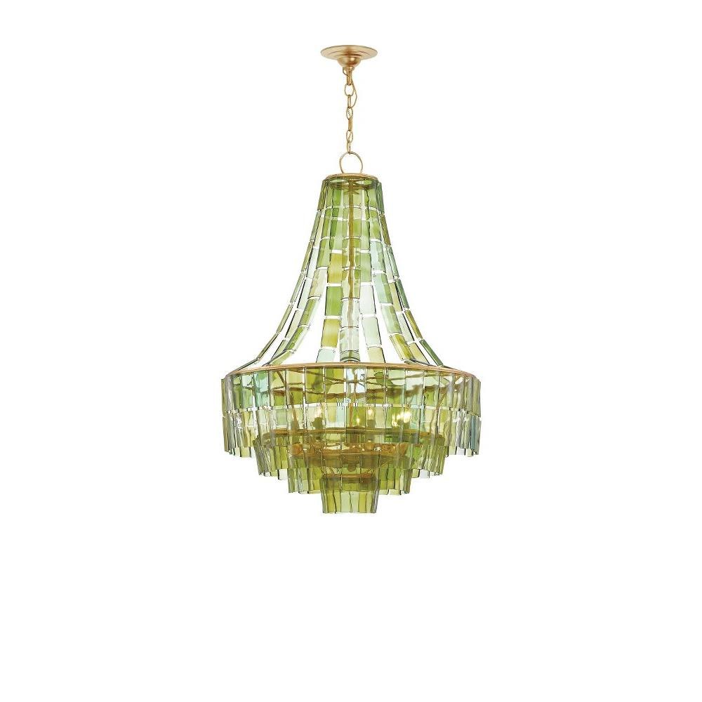 Cascading from the circular frames of our Vintner Chandelier are individually-cut pieces of green glass made from recycled bottles. The texture created by the varying hues of the glass beautifully complements the dark contemporary gold leaf finish on the wrought iron frame. This green chandelier is one of several in the Vintner family.