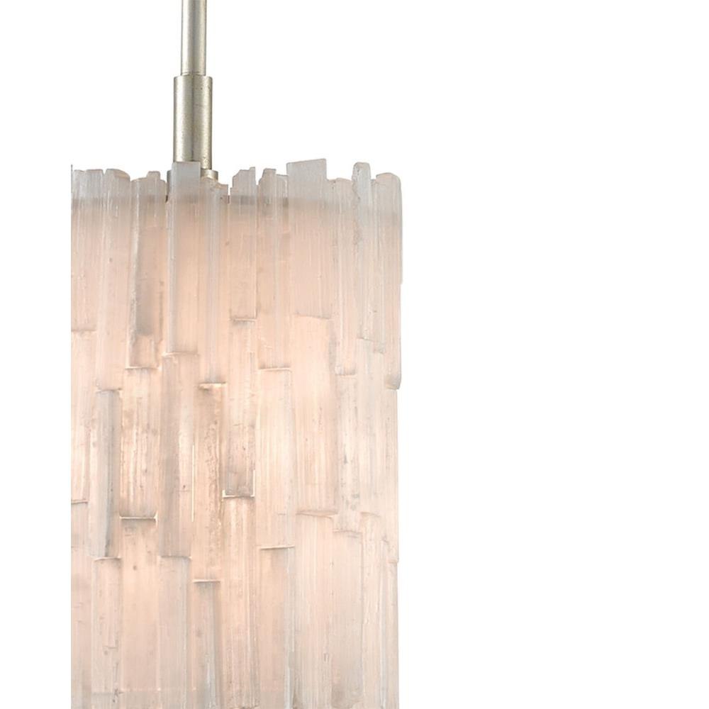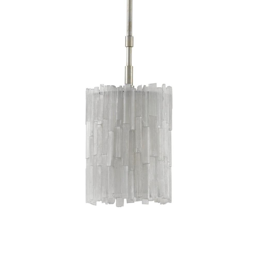 Our Moonstone Pendant in the Aviva Stanoff Collection has a shade of Selenite crystals dangling from a frame in a chinois silver leaf finish. This silver and crystal pendant quietly glows whether the lights are switched on or not. We also offer the Moonstone in a pendant with three shades.