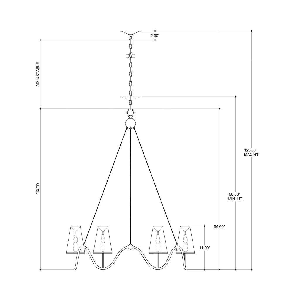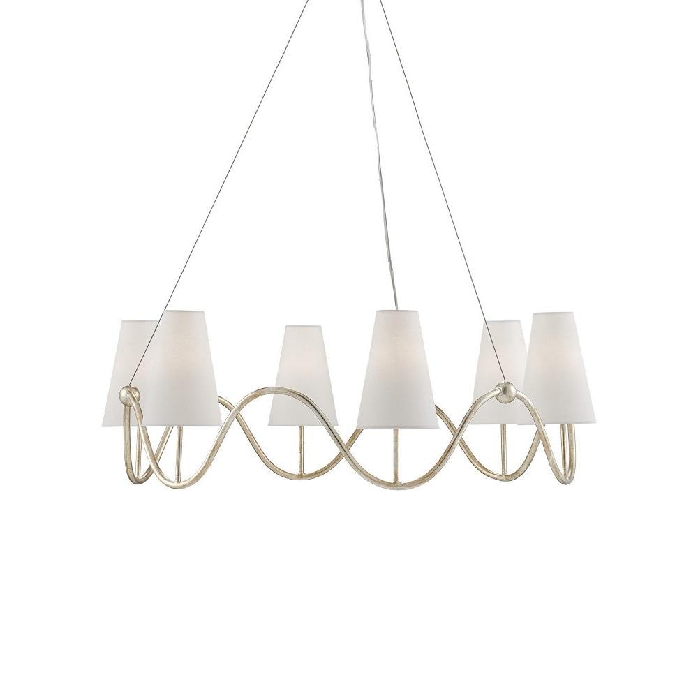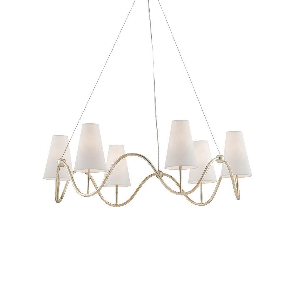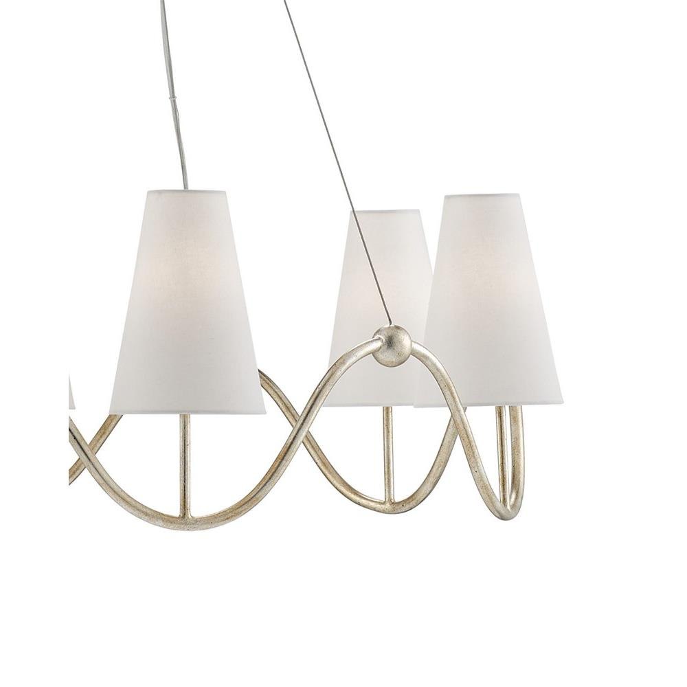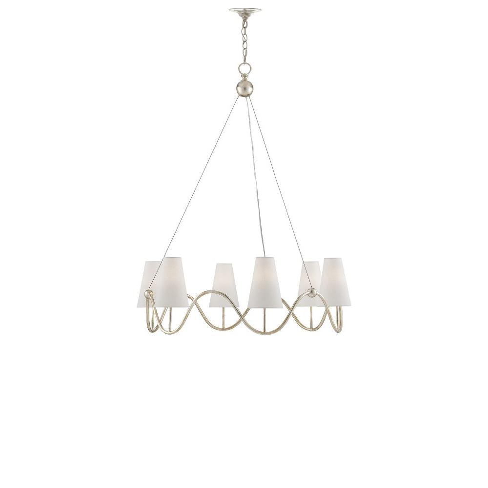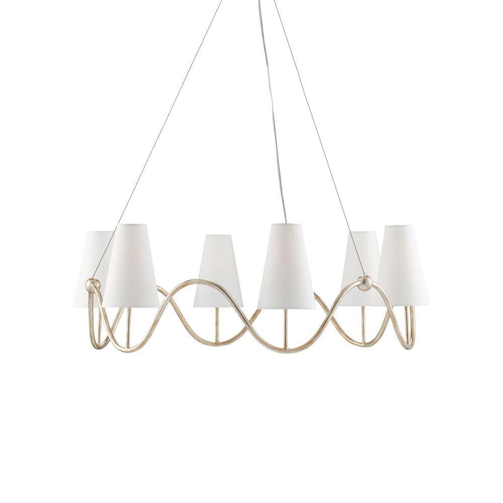 Our Kadir Chandelier is made of wrought iron in a silver Granello finish. The wave-like ring that holds the off-white linen shades covering the six lights is ornamented with tiny globes where the hardware meets the band. The silver chandelier illustrates the talent our artisans have for creating gleaming finishes.