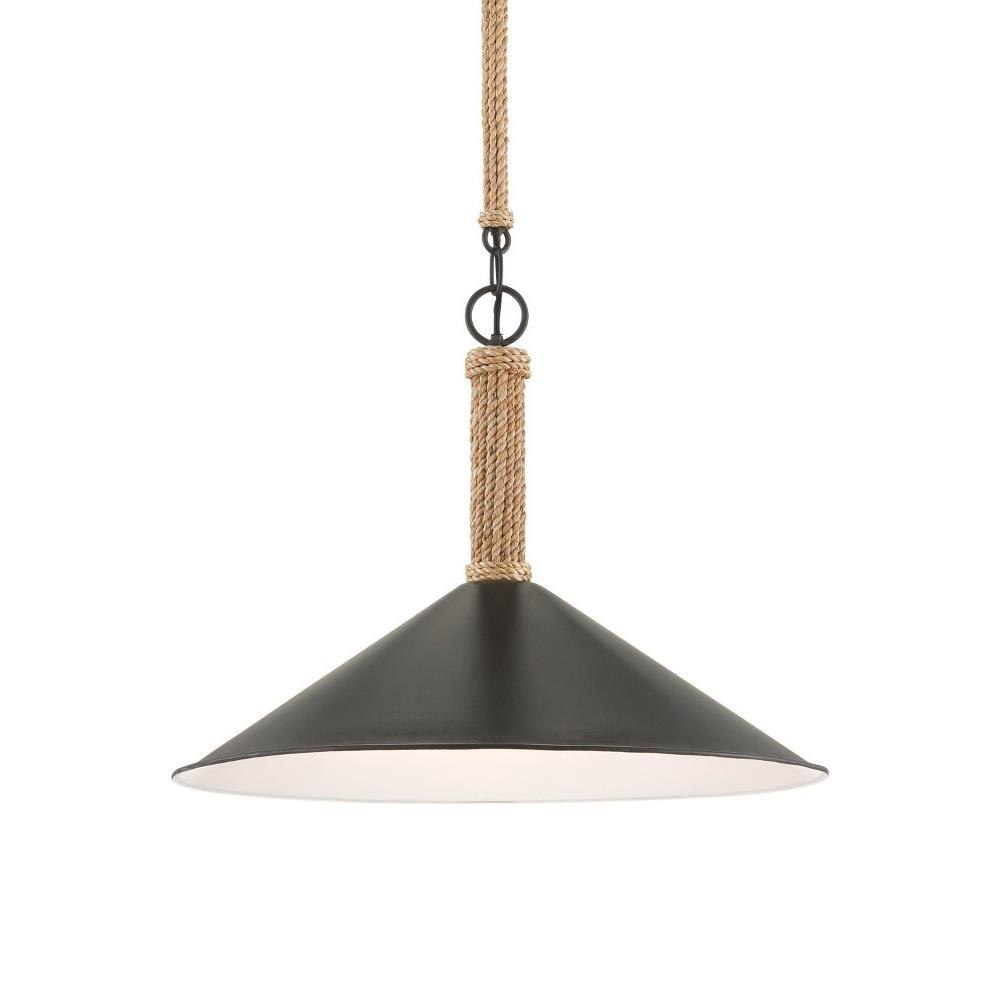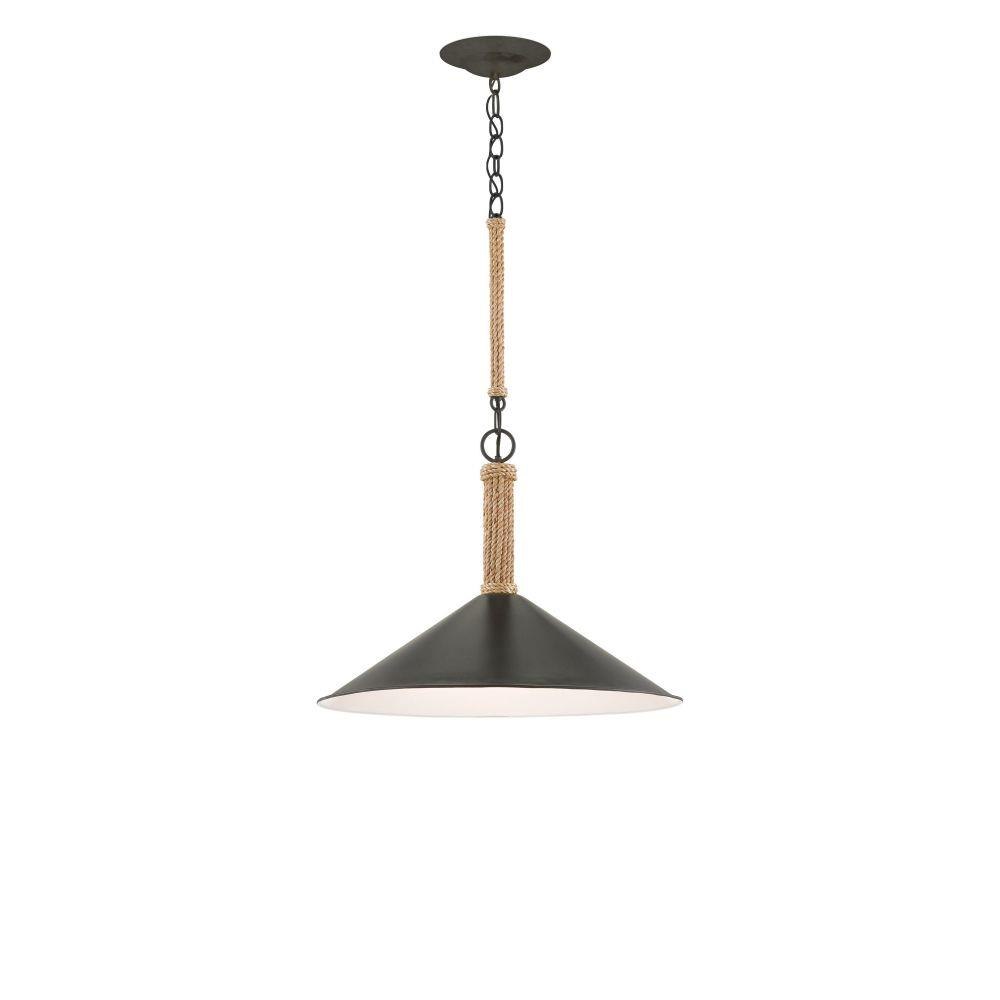 Designed by Tom Caldwell, the Ocracoke Pendant has a spun metal shade in a blacksmith finish. A design note worth mentioning is how it's hung: rope-covered metal links add a bit of natural charm to the black pendant. The interior of the shade, in a sugar white finish, makes its illumination crisp.