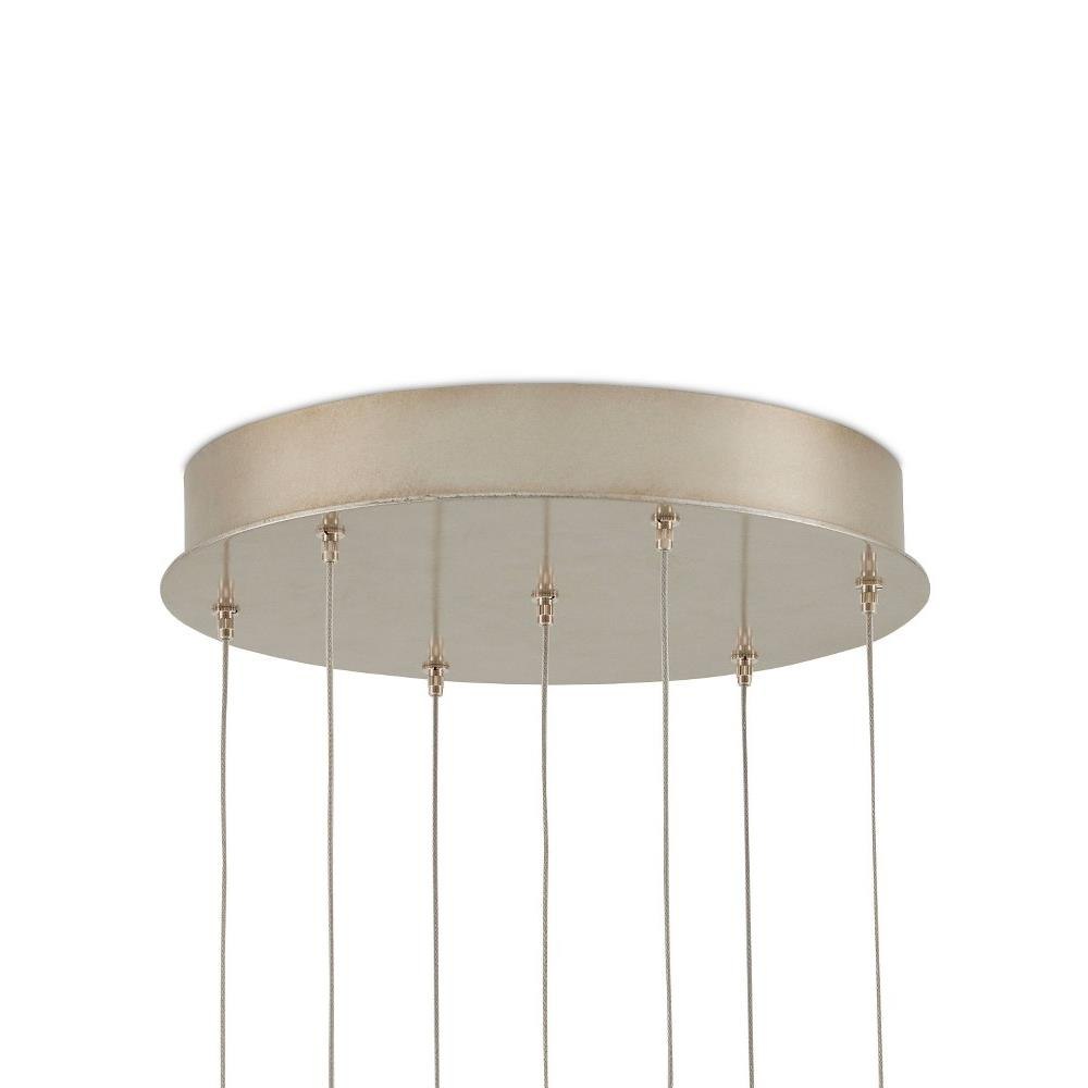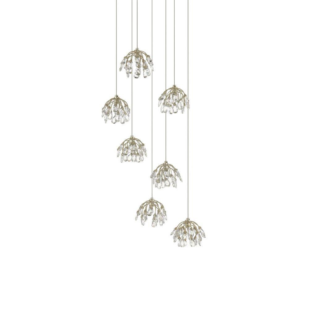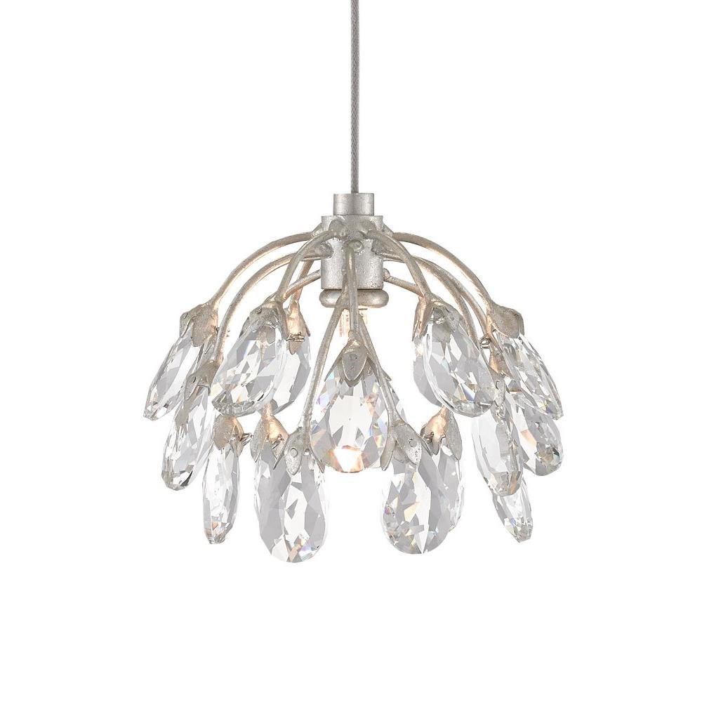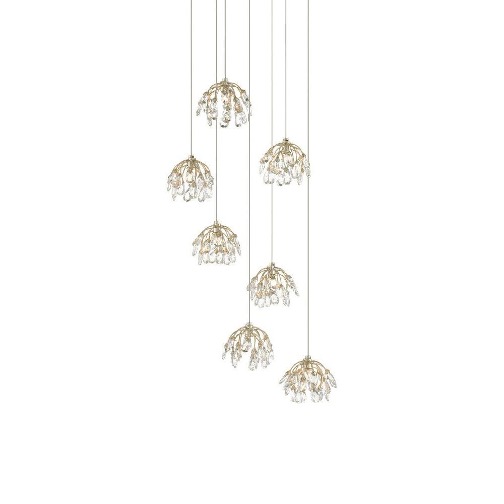 The Crystal Bud 7-Light Multi-Drop Pendant dangles flowers made of delicate faceted crystals from its canopy to make the shades effervescent and graceful. The silver pendant is luminous in its mix of painted silver and contemporary silver leaf finishes. This fixture is among Currey & Companys introduction of cluster lights, which includes 1-light up to 36-light configurations. We also have a number of chandeliers and orbs, and a wall sconce in this family of fixtures.