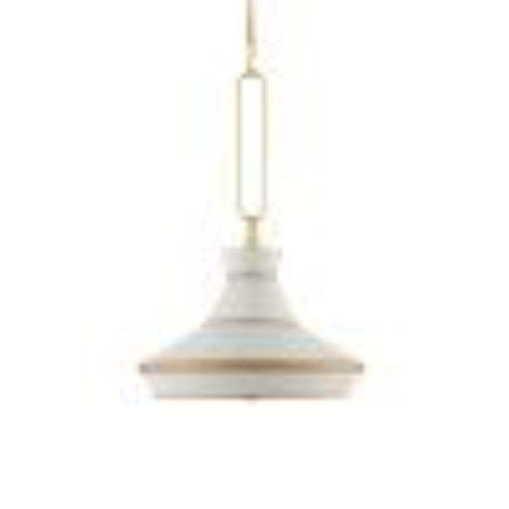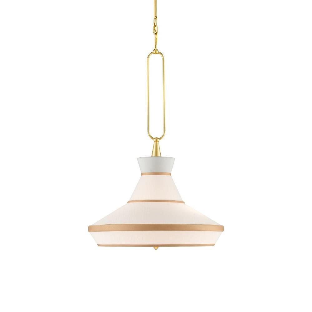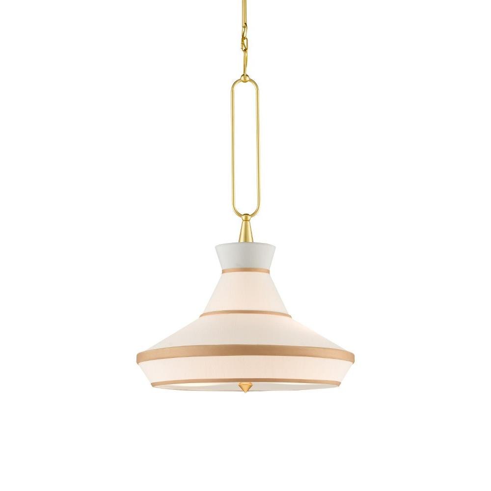 The Perth Pendant is made of metal in a mix of off-white and gold leaf finishes. Ian Thornton designed the gold and off-white pendant to be a new twist on a traditional pendant with a drum shade. Design details of note that he emphasized are the decorative loop and the finessed elements linking to it, the gold trim on the shade, and the acrylic diffuser.