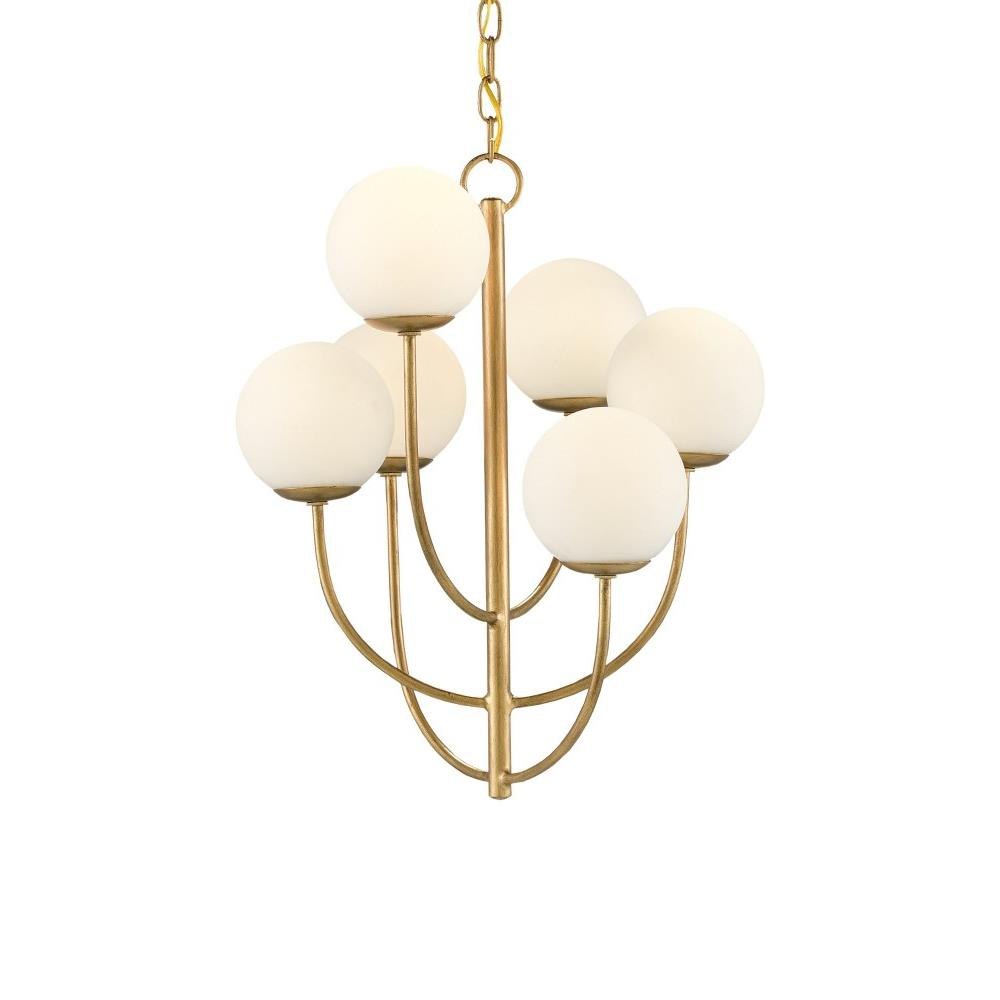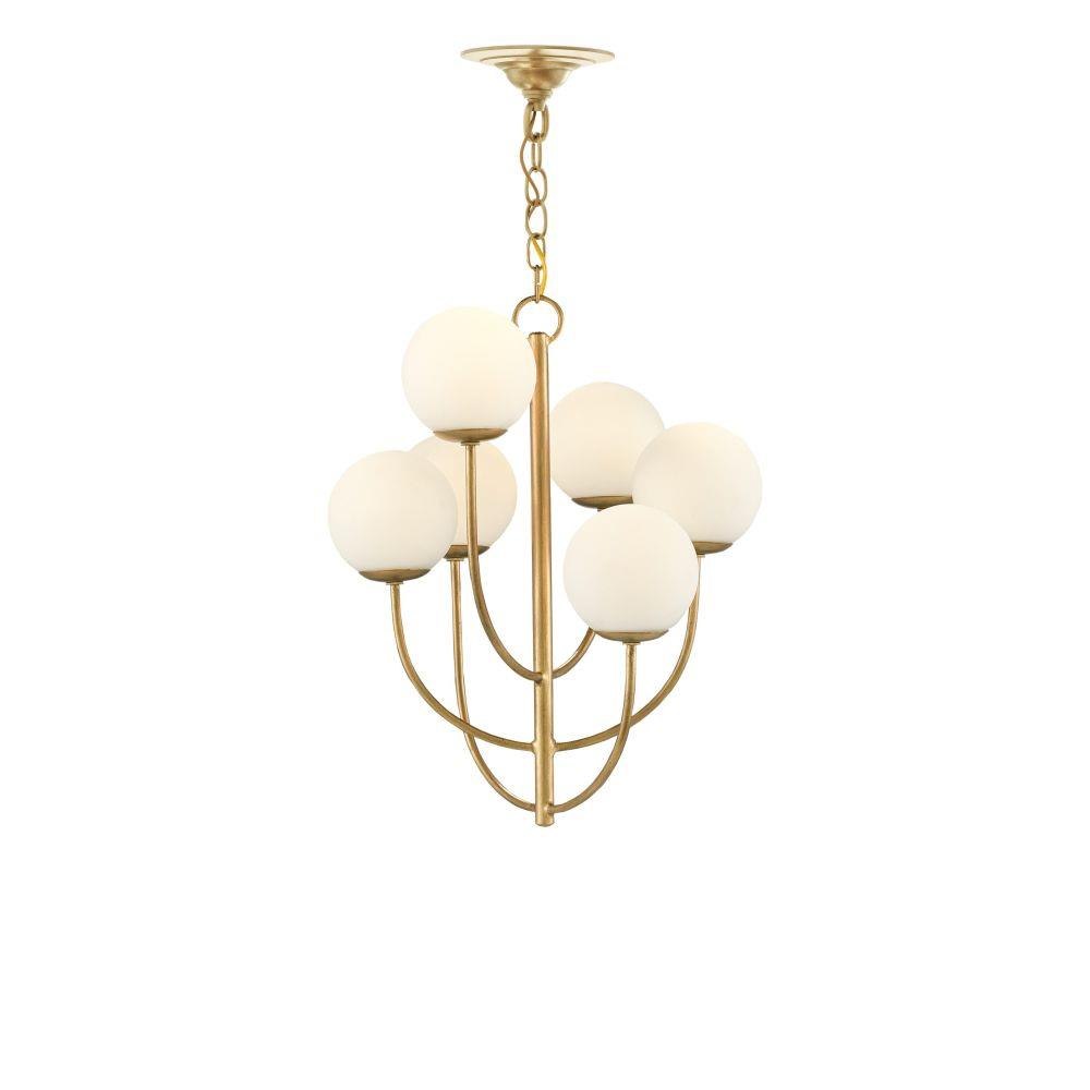 When mid-century modern was at its height, white glass globes were central to the designs produced by some of the greatest visionaries who've ever conceived products for the home. The Sunnylands Chandelier has this verve in its DNA. Made of wrought iron in a new brass finish, the long thin stem and arcing arms hold six opaque white glass globes in a staggered design that makes it seriously chic.