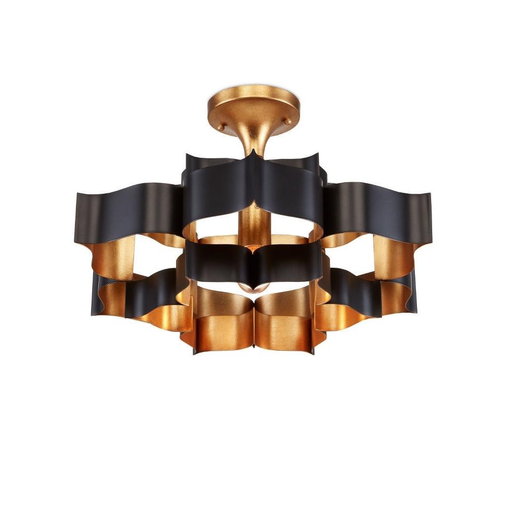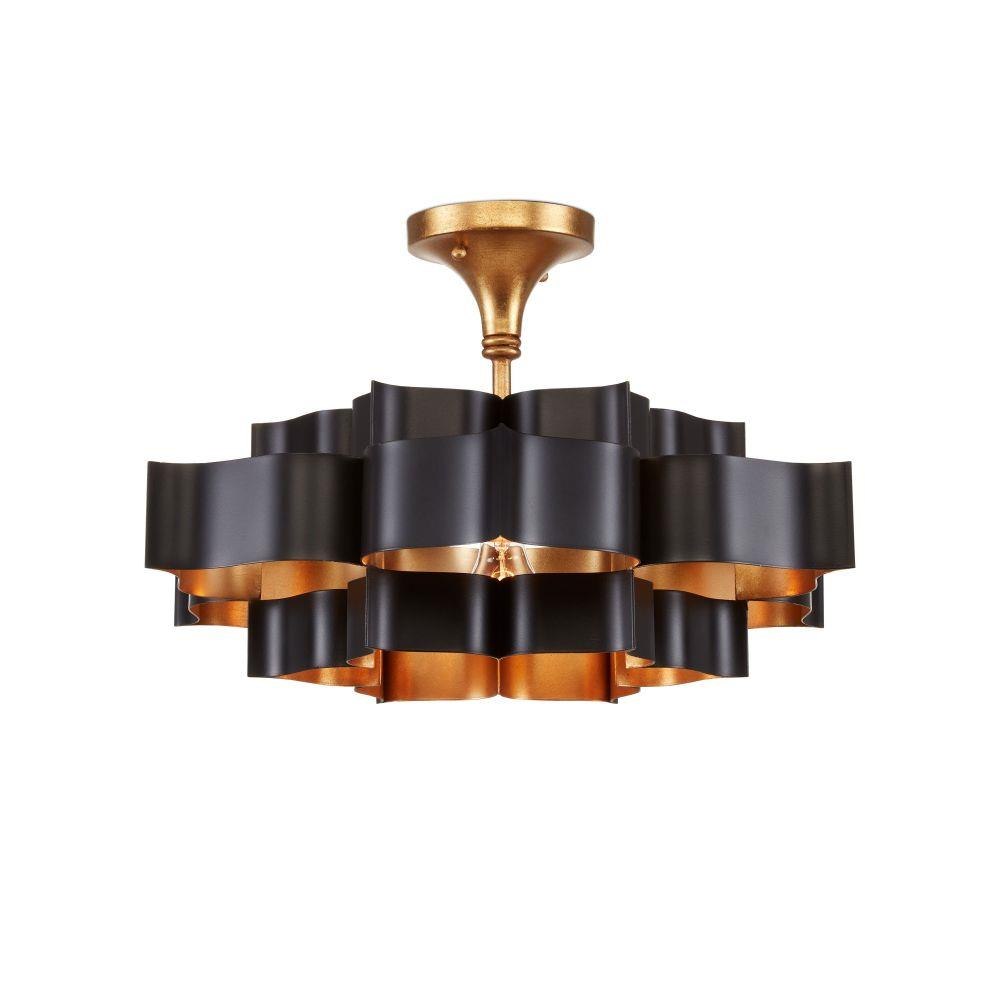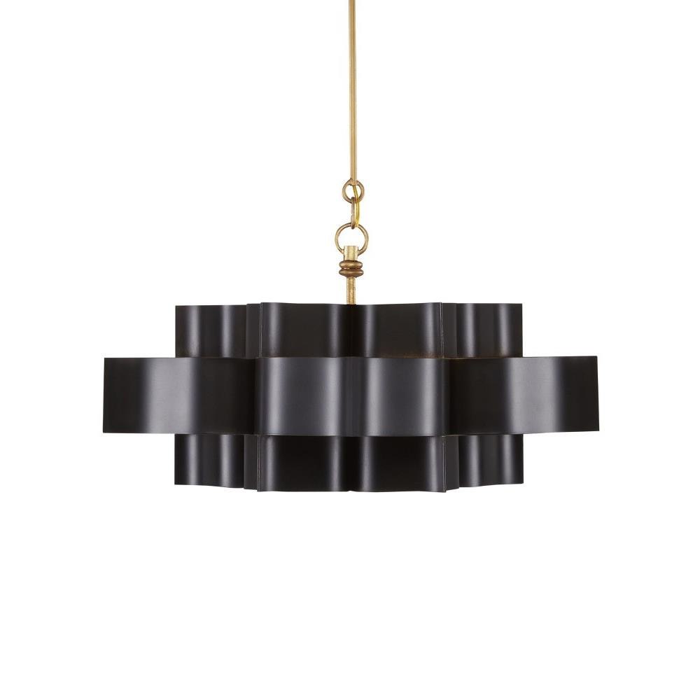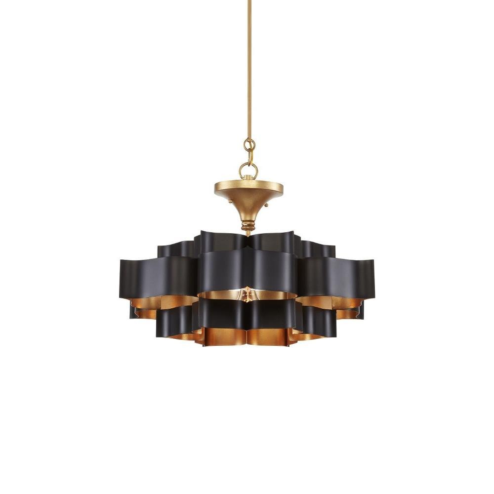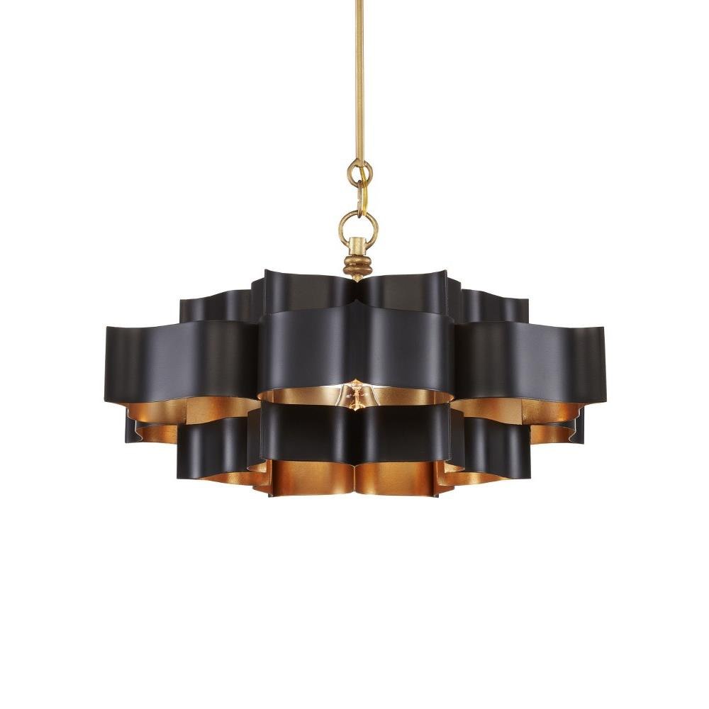 The Grand Lotus Black Small Chandelier receives its good looks from a combination of stunning workmanship and a mix of satin black and contemporary gold leaf finishes. The black chandelier is skillfully fashioned from wrought iron. We also offer several Grand Lotus styles in a number of sizes and finishes.
