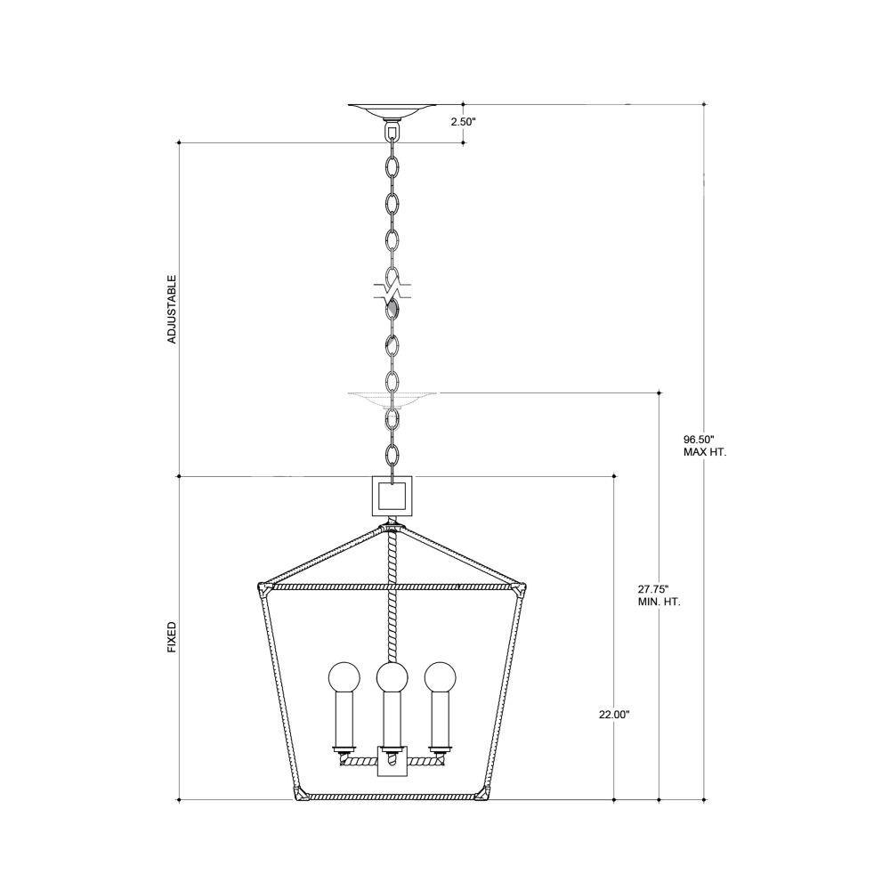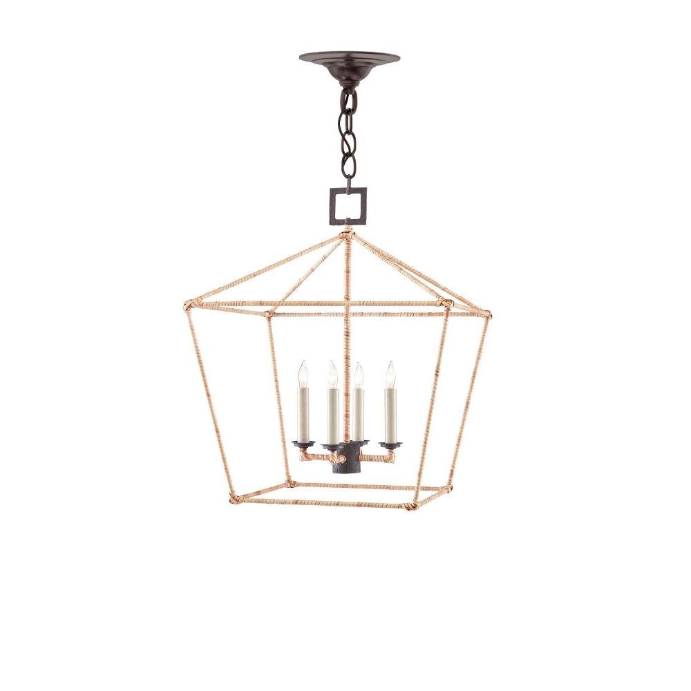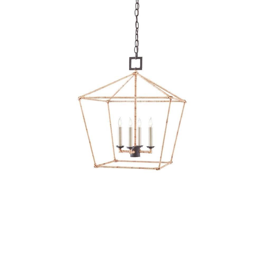 The Denison Rattan Medium Chandelier is a hammered wrought-iron fixture in a Mole black finish that is wrapped in rattan. The classic lantern shape has stood the test of time to make it one of our most popular offerings. A design element of note is the square that fastens the chandelier to the chain. This is one of a number of sizes and finishes in the Denison family.