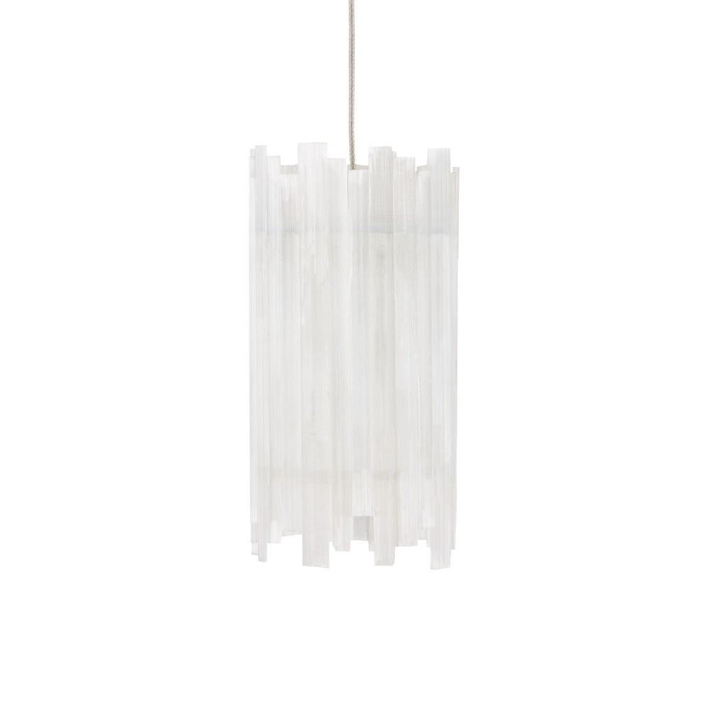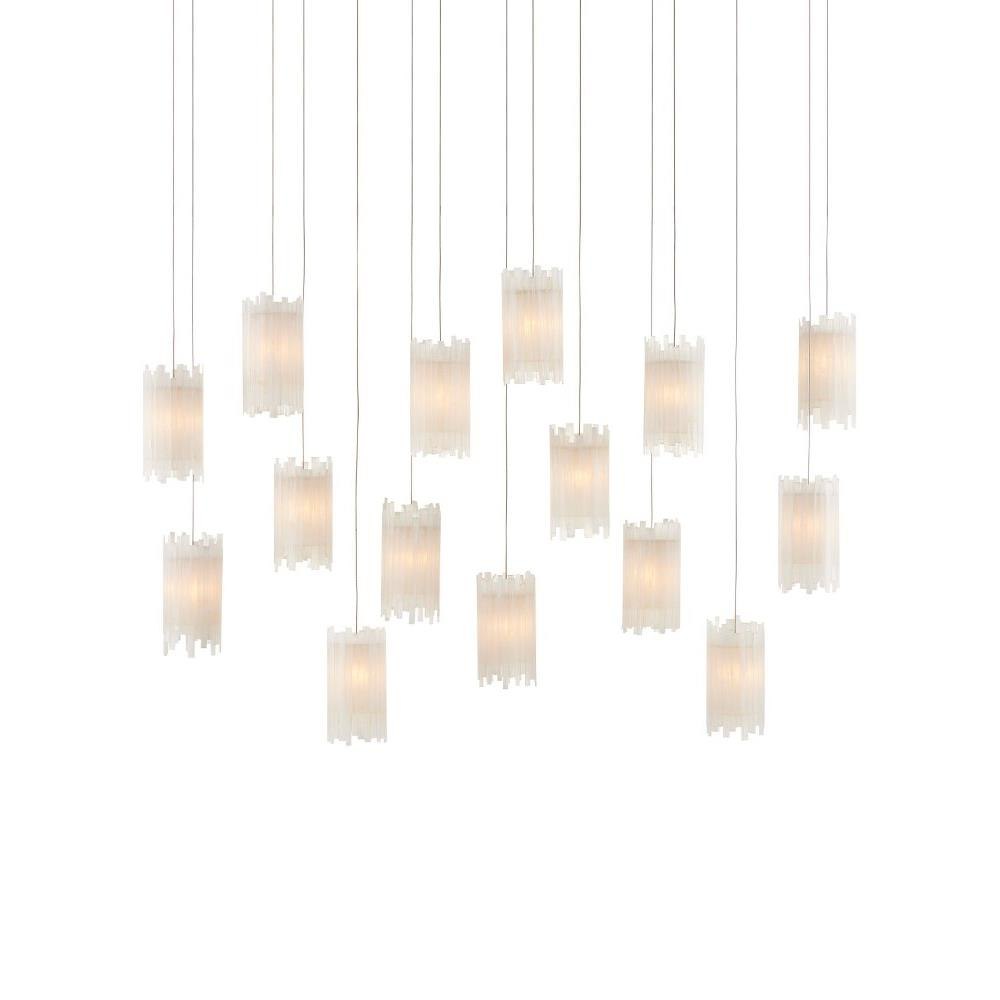 The Escenia Rectangular 15-Light Multi-Drop Pendant has shades made of natural selenite. The ribs of the essential natural material are staggered top and bottom, which brings the shape of the shades added interest. The metal stems in a painted silver finish are thin so that the shades seem to float. When the lights are switched on, a beautiful glow is created by the crystal bars. We offer the Escenia in a number of different configurations with multiple shades.