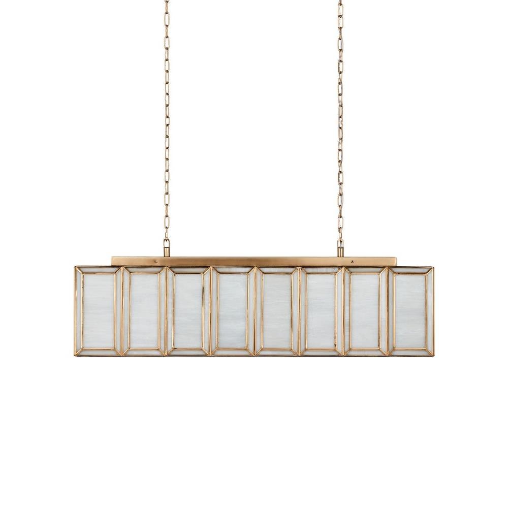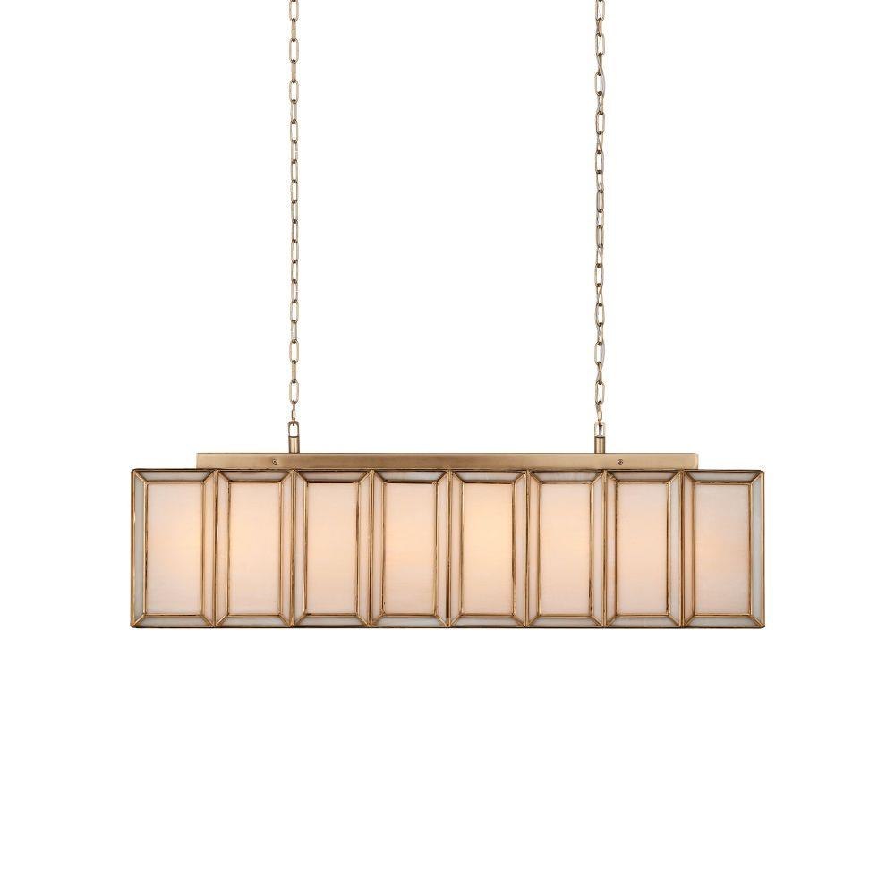 When a soft glow is desired, milk glass is one of the best materials to diffuse illumination. Our Daze Rectangular Chandelier is made of articulated panels of white milk glass that are joined together by ribs of metal in an antique brass finish. This white chandelier will turn luminous when it is switched on and will bring ample illumination to a long dining table or a kitchen island.