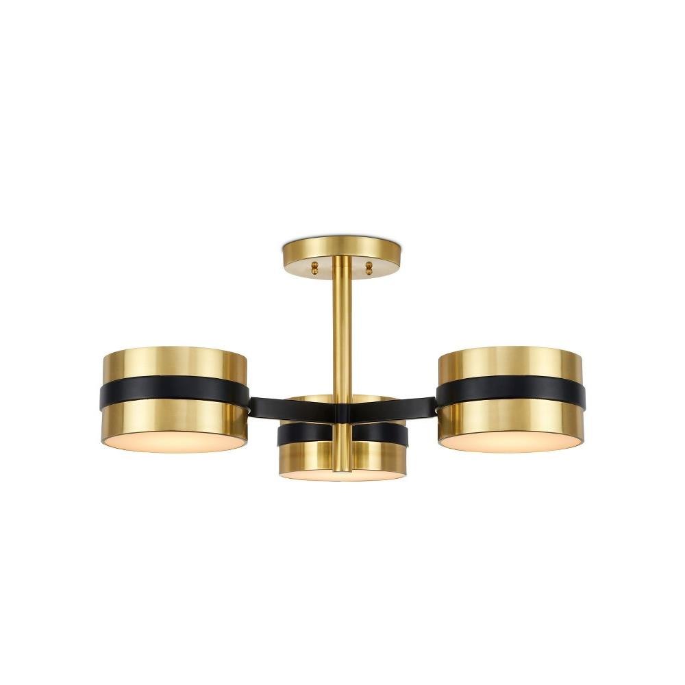 Taking his cues from mid-century modern design, Clarence Mallari envisioned the Heybrook Semi-Flush Mount to reflect the sensibilities of that lauded era. Made of metal in a mix of black and polished brass finishes, the gold semi-flush is fitted with integrated LED technology that is softened by white diffusers at the bottom of each of the three circlets holding the bulbs.