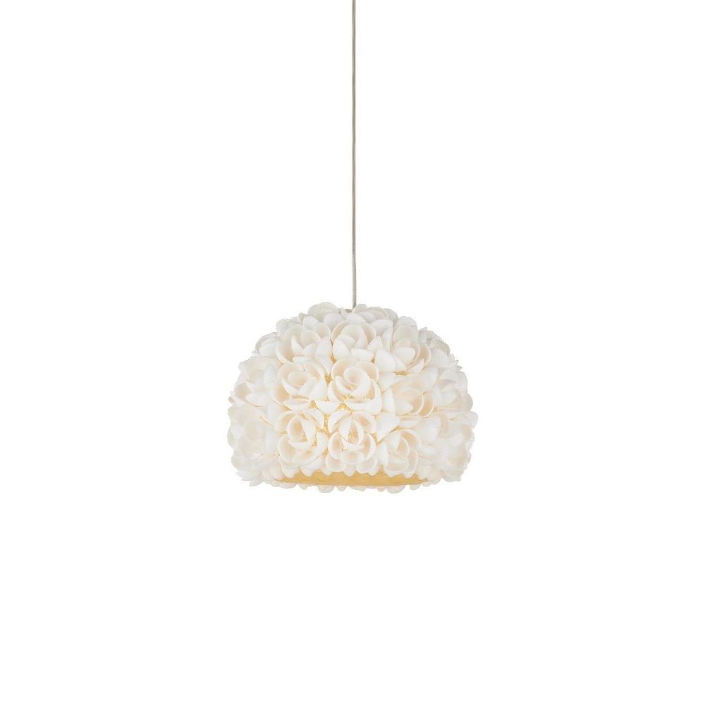 The Virtu 1-Light Round Multi-Drop Pendant has a beautifully composed shade around which clamrose shells are fashioned to look like rosebuds; each petal hand-placed to make this an artisanal offering. The way the illumination wafts through the shade and surrounds the shells is a design detail of note with this lovely nature-inspired luminary.