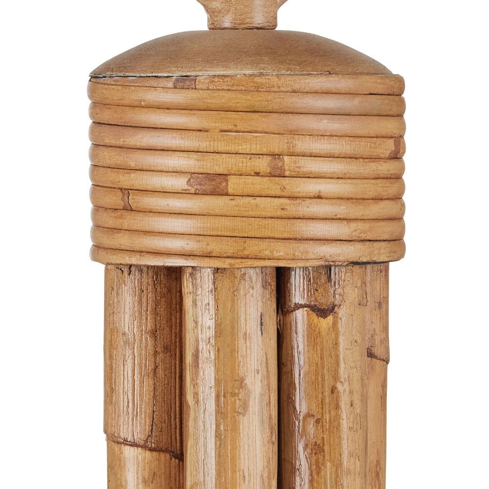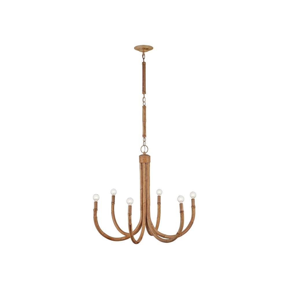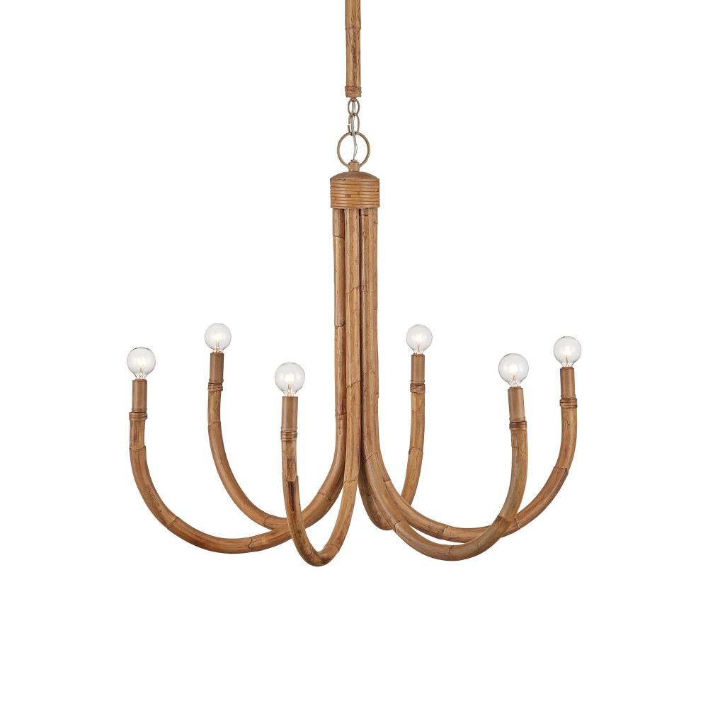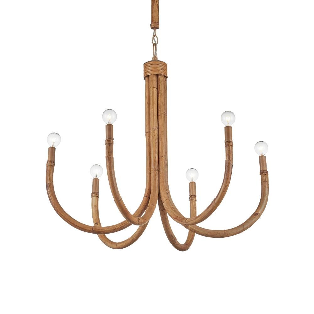 The Samsara Small Chandelier is crafted from thick reeds of rattan, skillfully bent into elegant upward curves that support six lights. Working with rattan of this scale requires both precision and strength. The design is grounded in warm, earthy tones, with saddle tan-finished candle sleeves and hardware that complement the natural material. Thinner, tone-on-tone rattan ties complete the structure, maintaining a cohesive and organic aesthetic. Adjustable from 35" to 115.5" with use of included chain/rod kit/cable. If your space calls for a longer drop, additional chain/rods/cable is available for purchase.
