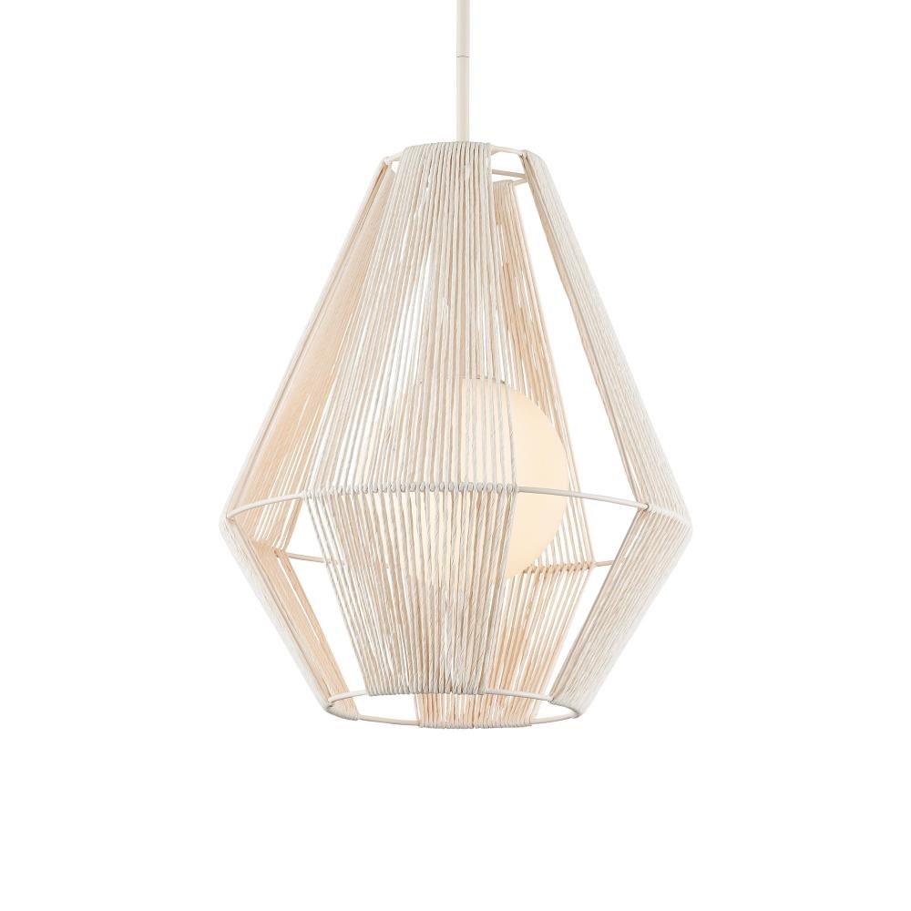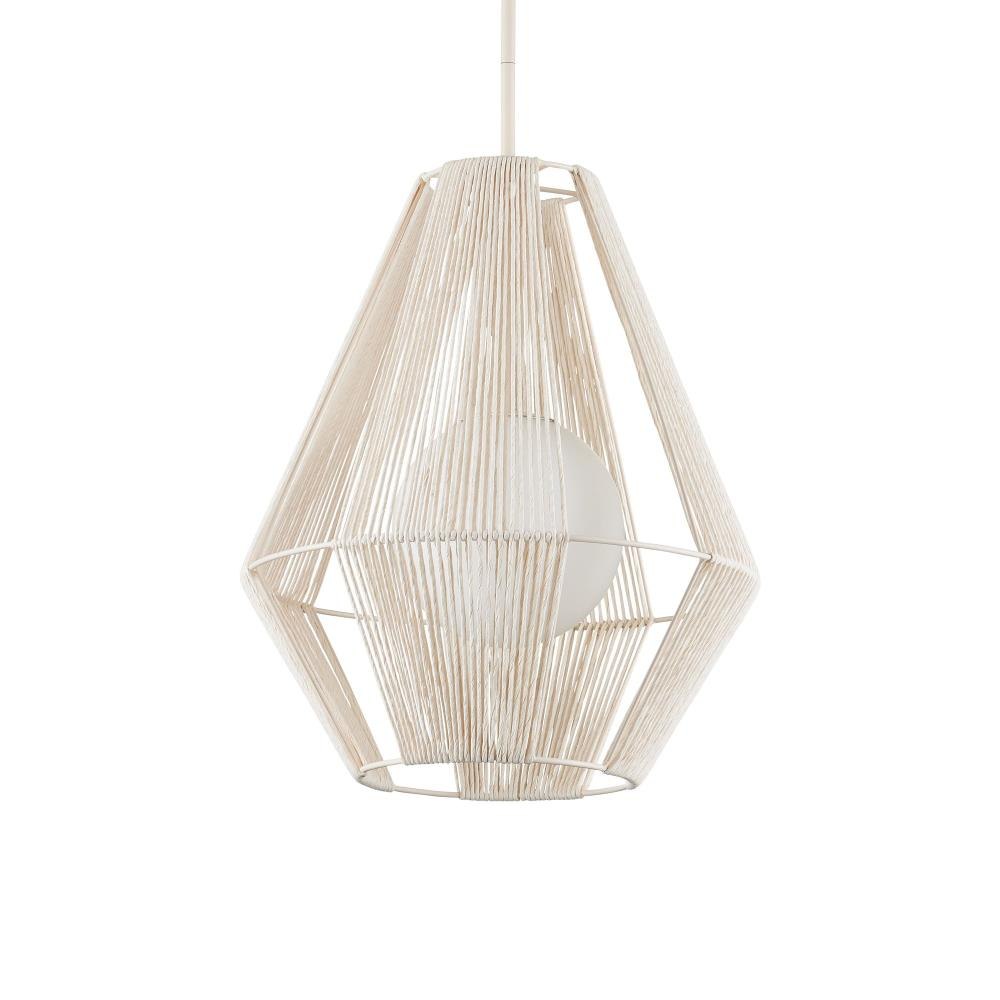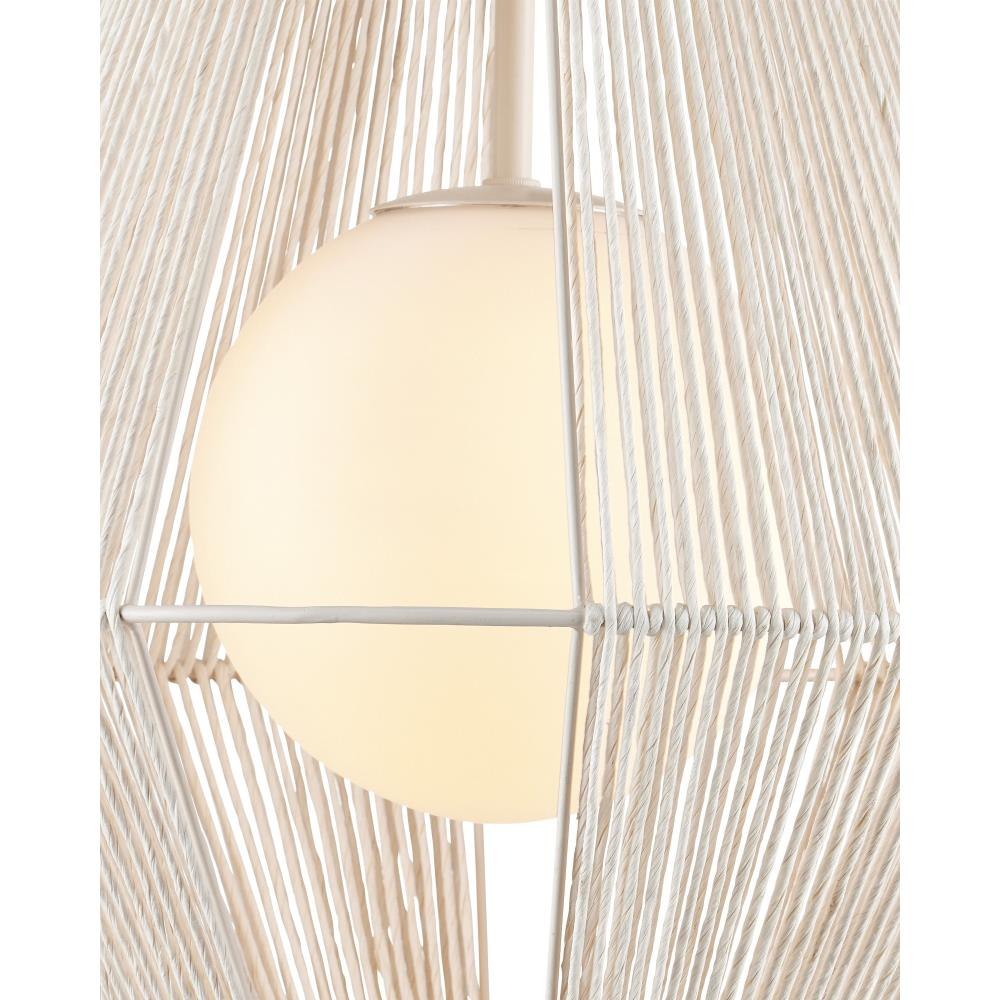 The Fraxel Pendant has mid-century modern lines crafted from bleached Kraft paper twine, carefully double-wrapped around both the interior and exterior of a wrought iron frame. The vanilla finish on the frame complements the pale tone of the twine, highlighting its texture and construction. Inside, a frosted glass globe houses a single dimmable bulb. The pendant flares to 17 inches in diameter at its widest point. Adjustable from 27.5" to 69.5" with use of included chain/rod kit/cable. If your space calls for a longer drop, additional chain/rods/cable is available for purchase.
