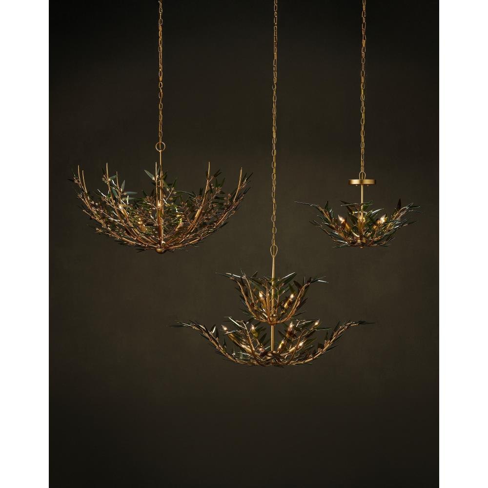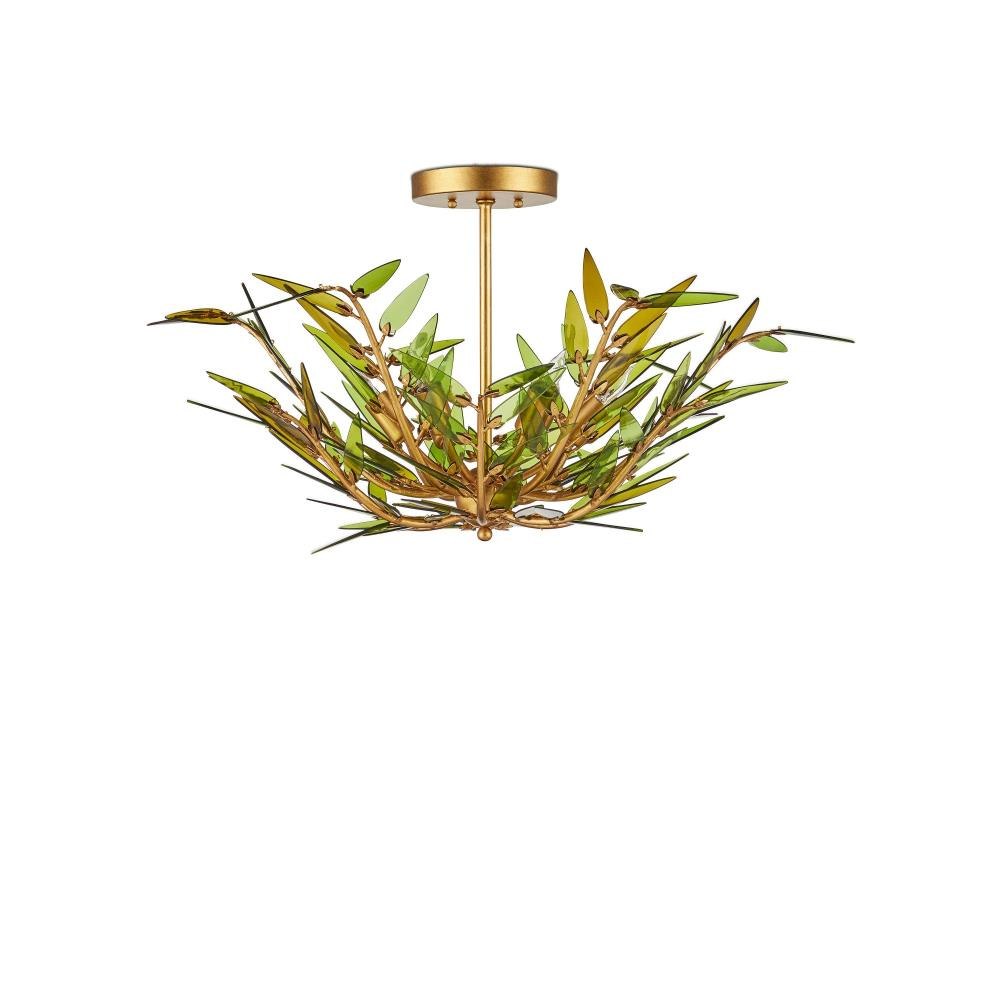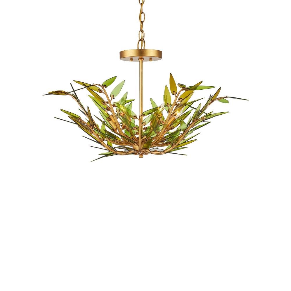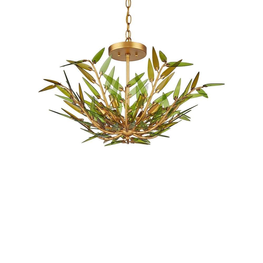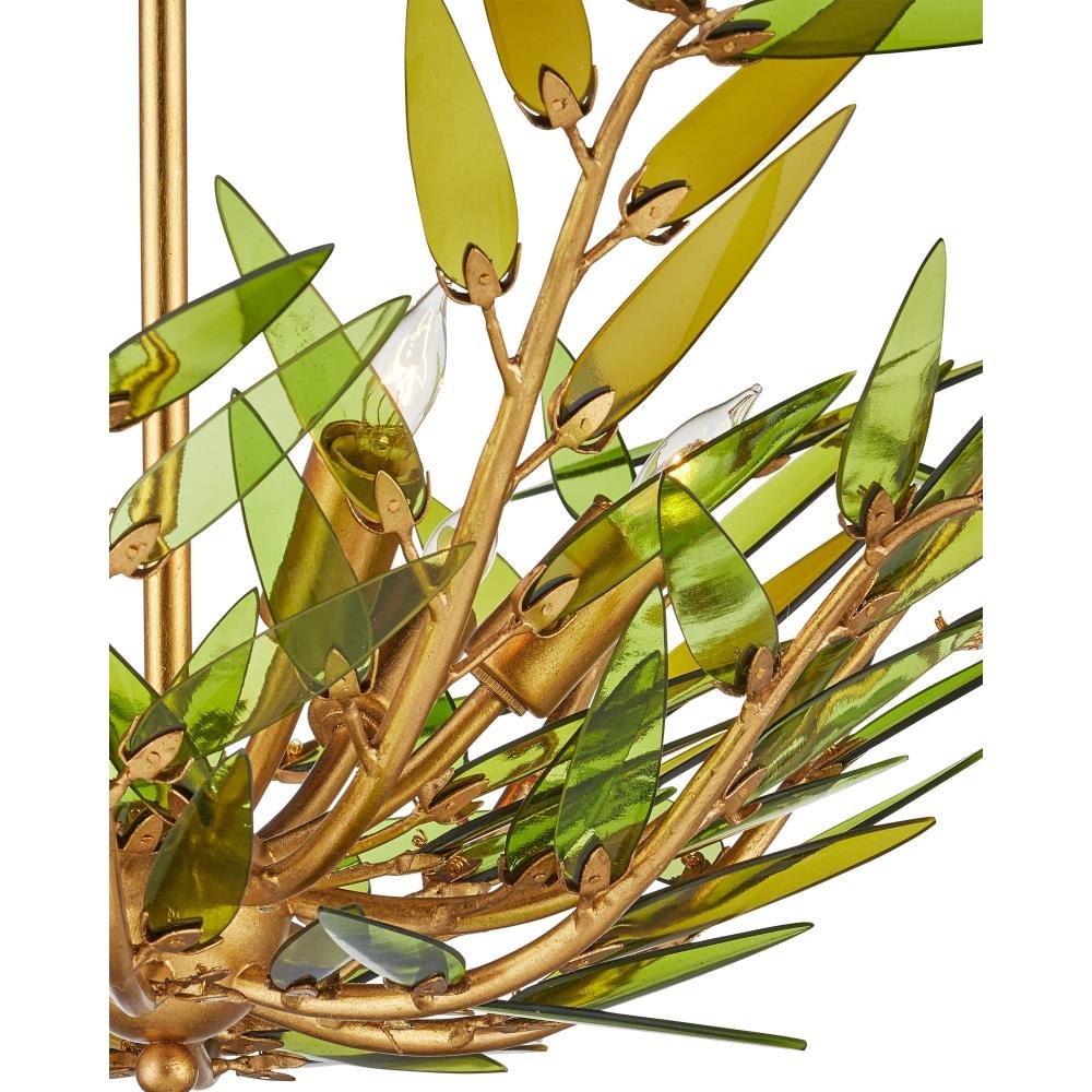 The Babylon Pendant/Semi-Flush has a profile shaped like an elegant flower created by curving wrought iron rods in a contemporary gold leaf finish. The tapering stems are fitted with spikey leaves made of green glass, which have been cut from recycled wine bottles. These individually placed accents give the pendant a dynamic, wind-swept appearance, blending sustainable materials with sculptural detail. There will be slight variations in color in the leaves on this six-light pendant that is dimmable and convertible to a semi-flush. Adjustable from 15" to 91" with use of included chain/rod kit/cable. If your space calls for a longer drop, additional chain/rods/cable is available for purchase.