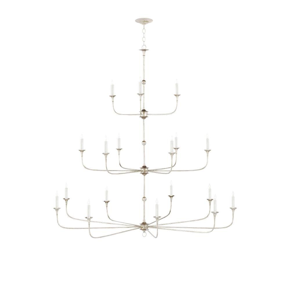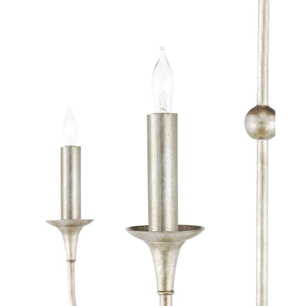 The Nottaway Grande Champagne Chandelier features slender arms that extend with subtle curves from petite cogs positioned at three points on its elongated stem. A delicate ring detail adds a refined touch to the lower tier. Finished in a soft champagne silver, the chandelier’s vertical scale and open profile make it especially suited to rooms with high ceilings where its form can be fully appreciated. Adjustable from 70" to 138" with use of included chain/rod kit/cable. If your space calls for a longer drop, additional chain/rods/cable is available for purchase.