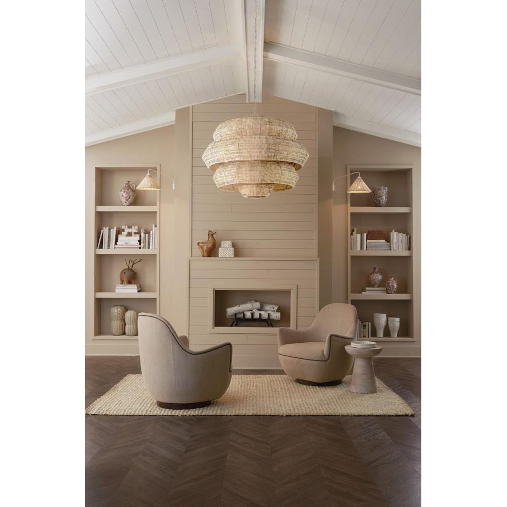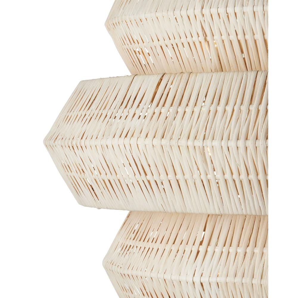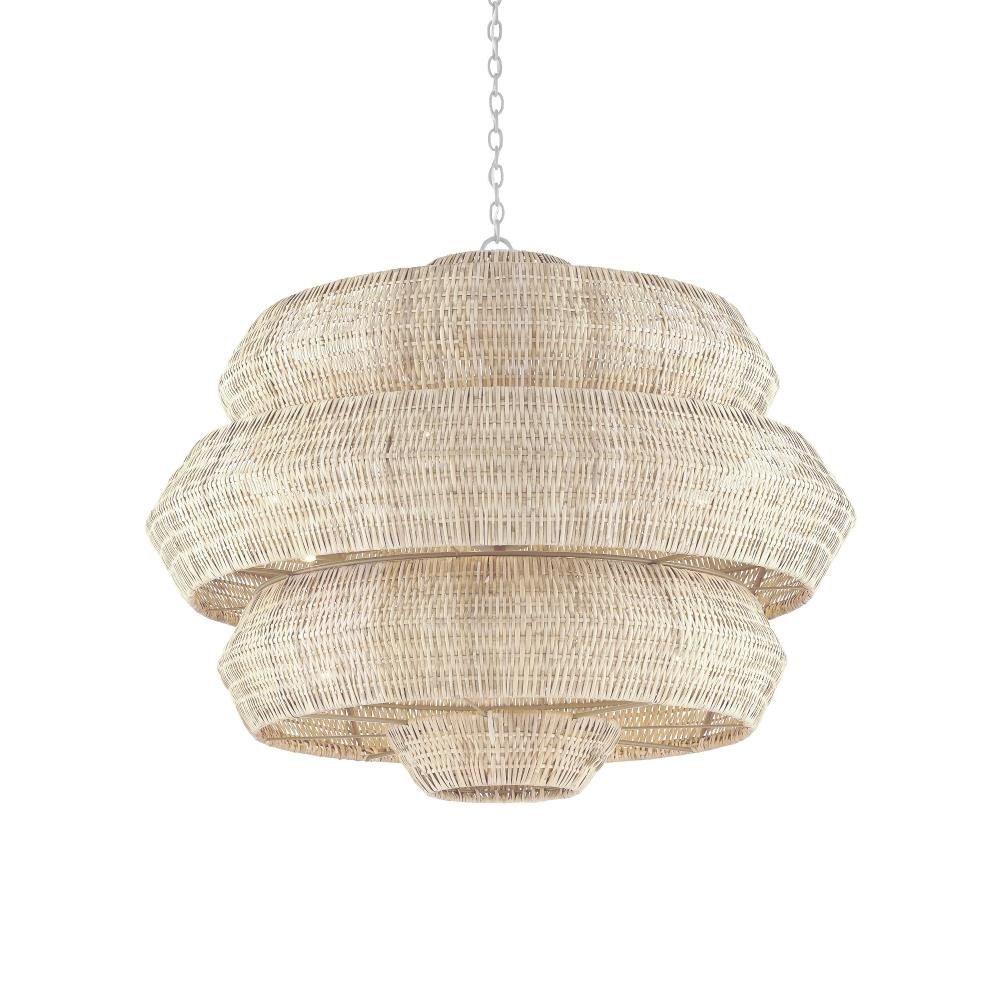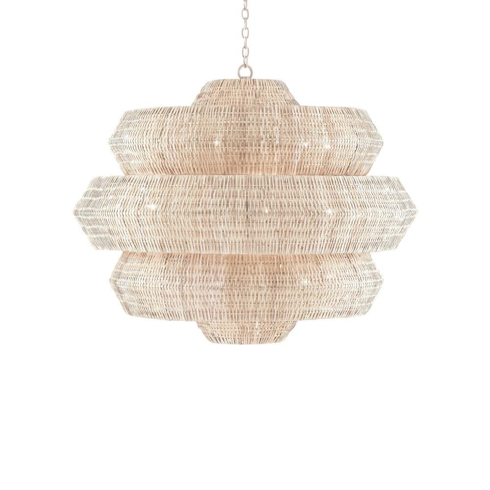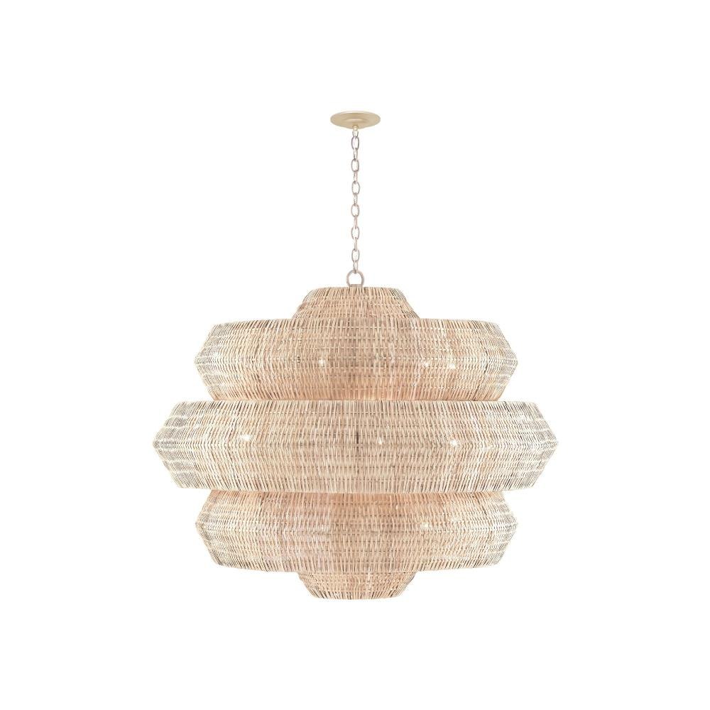 The Antibes Grande White Chandelier is crafted from natural bleached rattan woven over a geometric wrought iron frame finished in snow white. Its bold scale—measuring 48 inches in diameter—gives it strong visual presence, while the airy structure keeps it light in feel. Eighteen lights are nestled within it, offering ample illumination and highlighting the texture of the natural materials. Adjustable from 48" to 139.5" with use of included chain/rod kit/cable. If your space calls for a longer drop, additional chain/rods/cable is available for purchase.