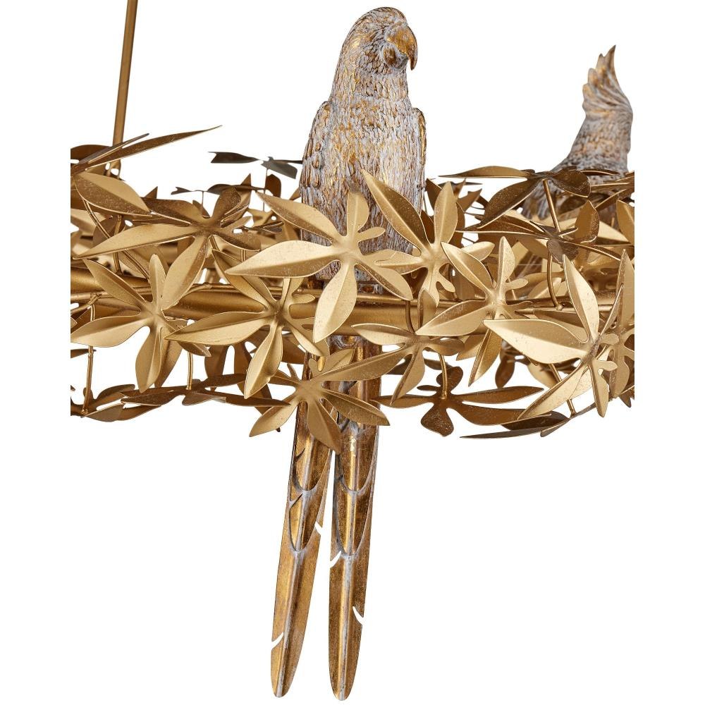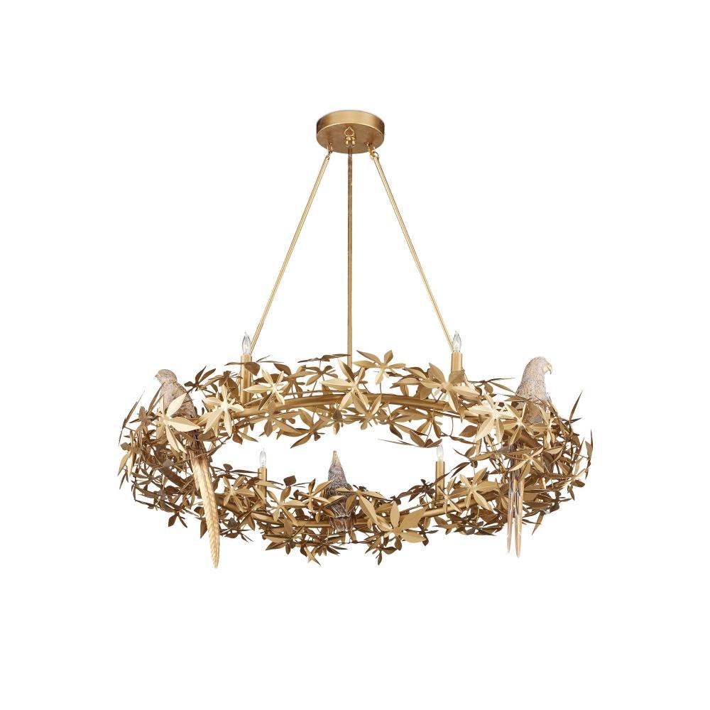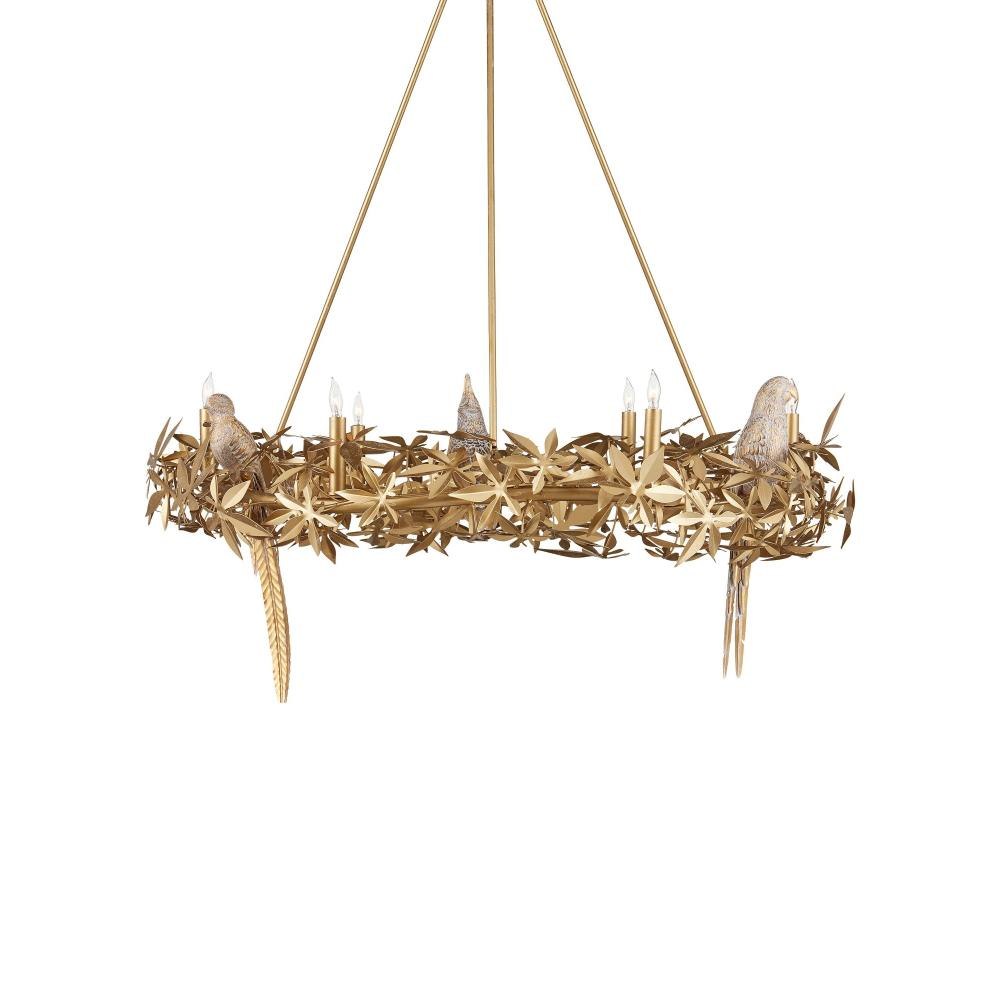 The Aviary Gold Ring Chandelier showcases flowing leaf and floral motifs in a refined Swedish Gold finish. Perched among the botanical elements are sculptural birds—cockatiels, sparrows, and macaws—based on original carvings by a skilled sculptor. Free-flowing metal feathers add dimension and artistry, making this chandelier a striking fusion of nature and craftsmanship. Adjustable from 41.25" to 116.75" with use of included chain/rod kit/cable. If your space calls for a longer drop, additional chain/rods/cable is available for purchase.