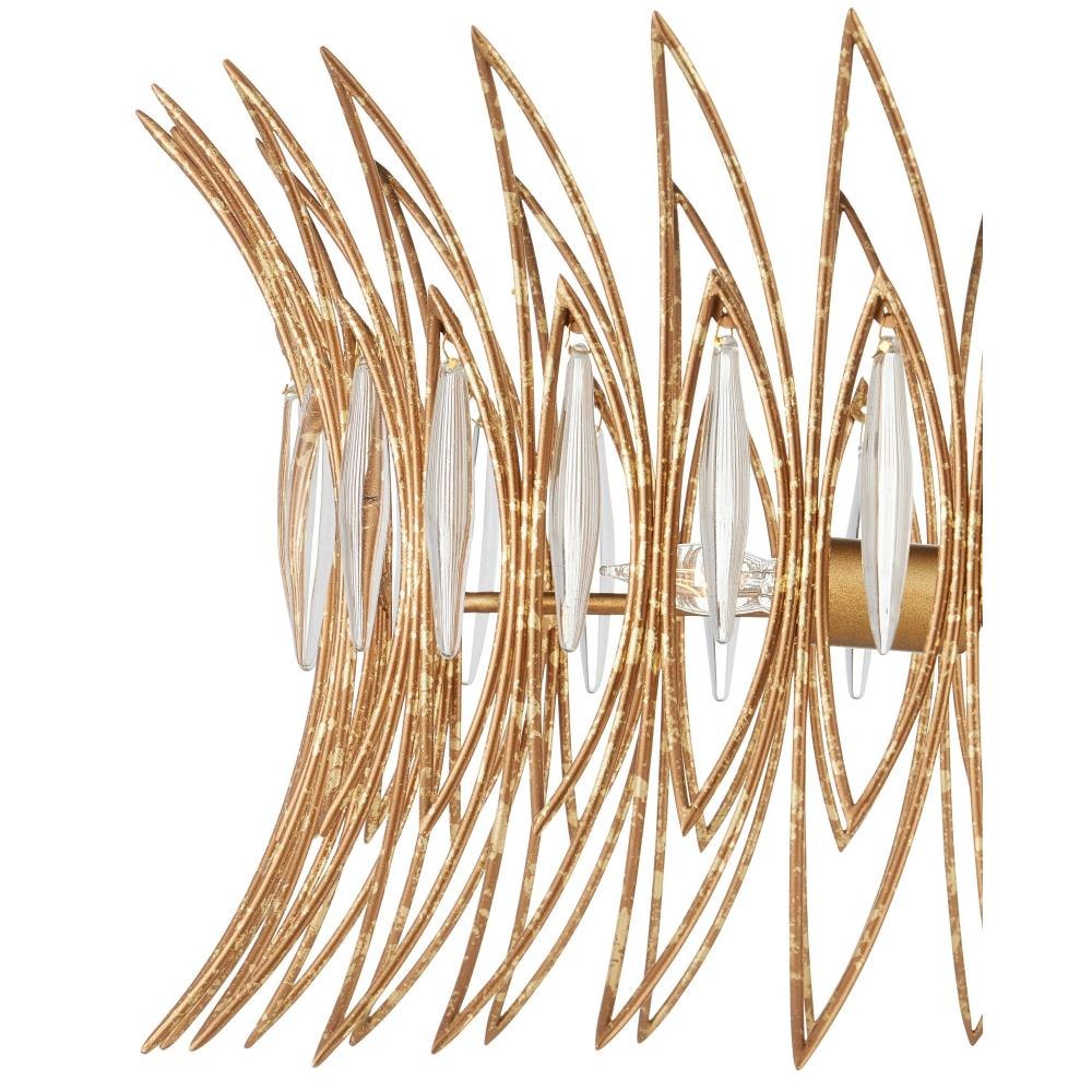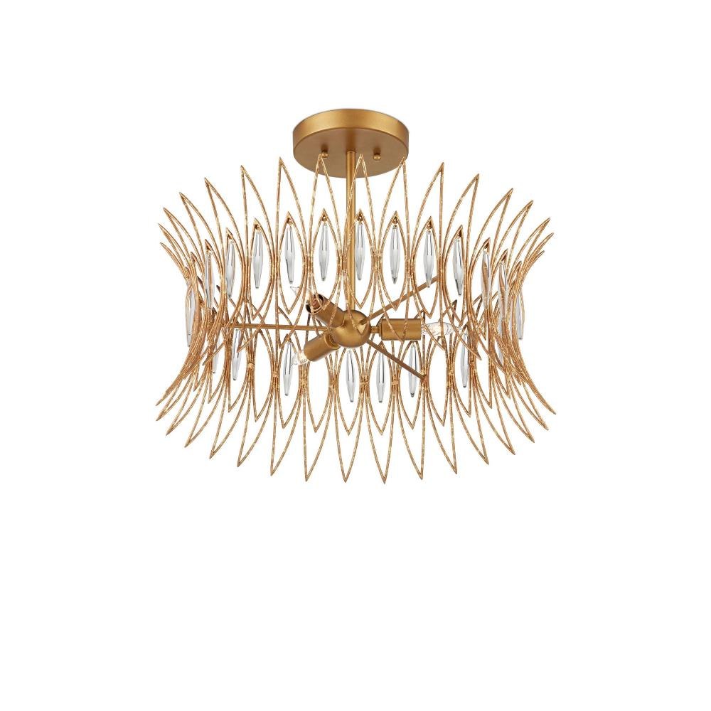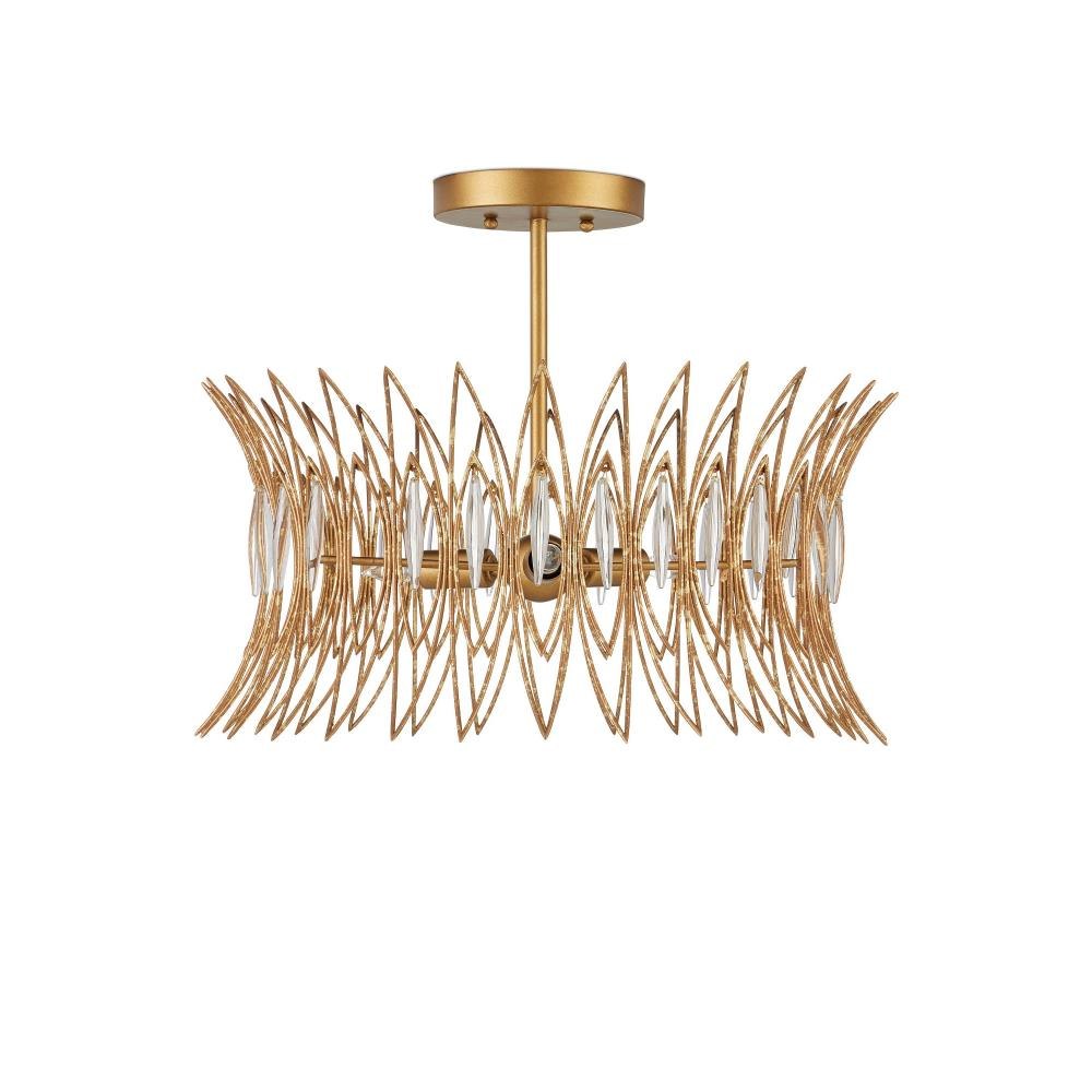 The Marquise Semi-Flush Mount is crafted from slender wrought iron wires in a Luxor gold finish, giving the surface a subtly speckled texture. Inspired by mid-century jewelry design, the crown-like frame holds abstract leaf motifs, each of which is adorned with an oblong piece of clear glass that catches and diffuses the light from the three bulbs within.