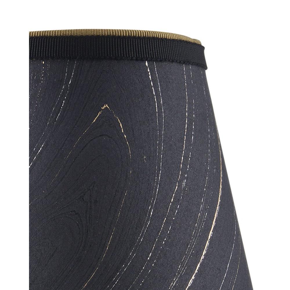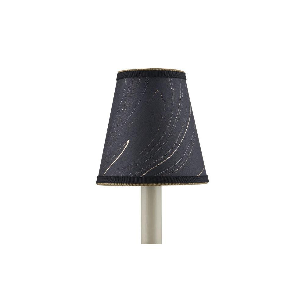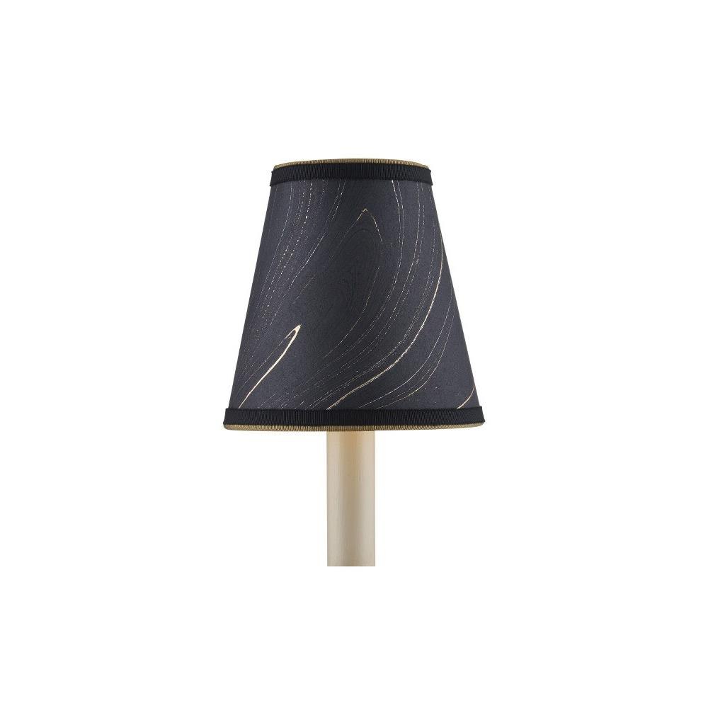 Petite shades are an easy way to bring added style to a space while also introducing color and texture, particularly when they are made from artisanal marbleized paper and ornamented with two layers of grosgrain ribbon in different hues. The saturation of the colors on the handmade tapered and cylindrical shades for chandeliers and wall sconces is achieved by a New England atelier. Patterns will vary because they are created during a very organic process that makes any surface treated to marbleizing so special. There are both vivid and pastel patterns in this collection, as you can see from this black, gold, and silver version of the tapered shade. Top Diameter: 3" Bottom Diameter: 5" Height: 5"