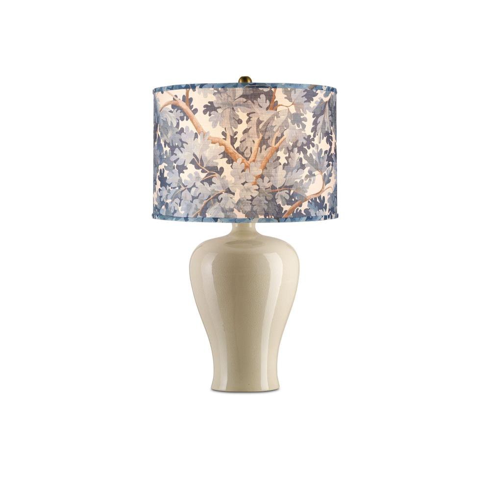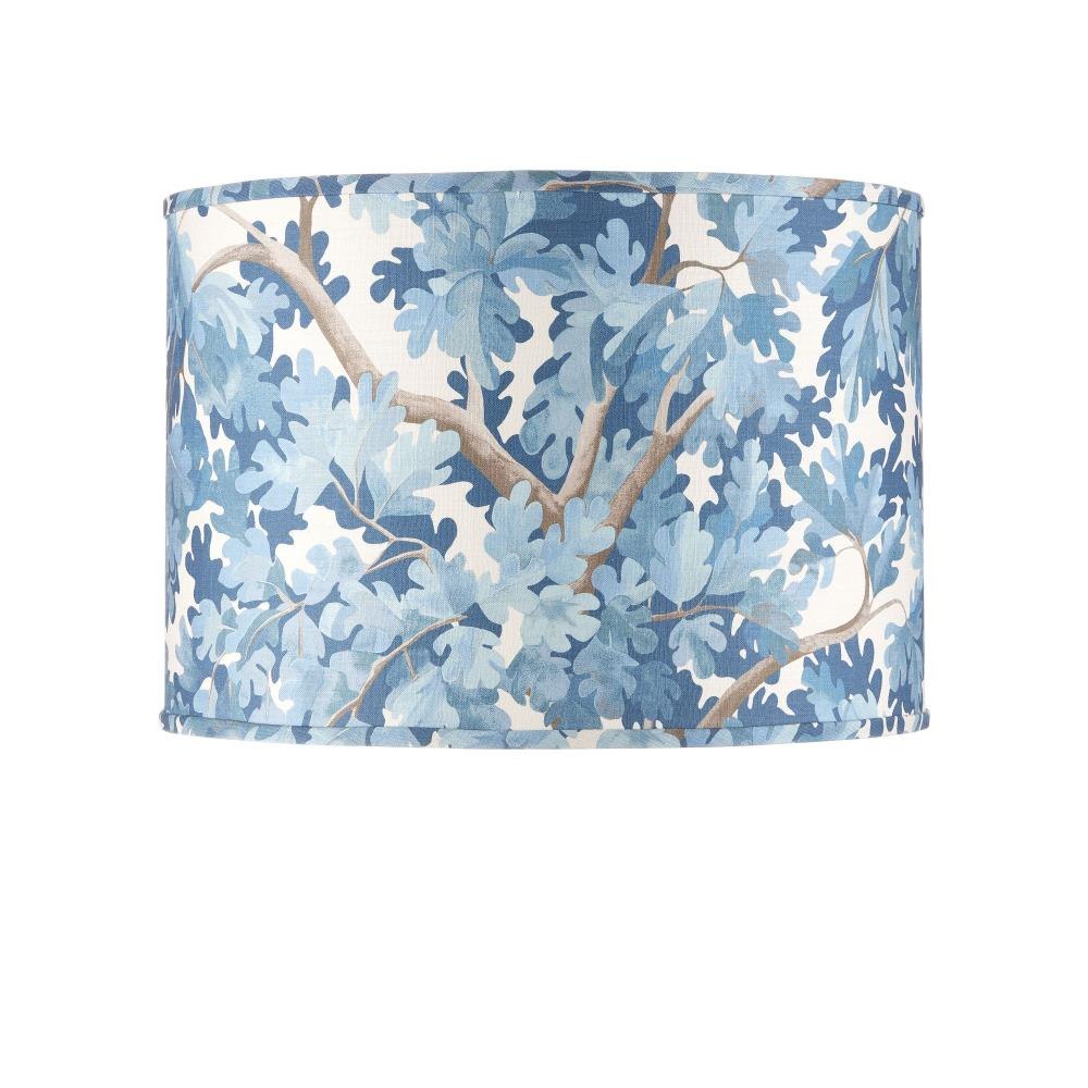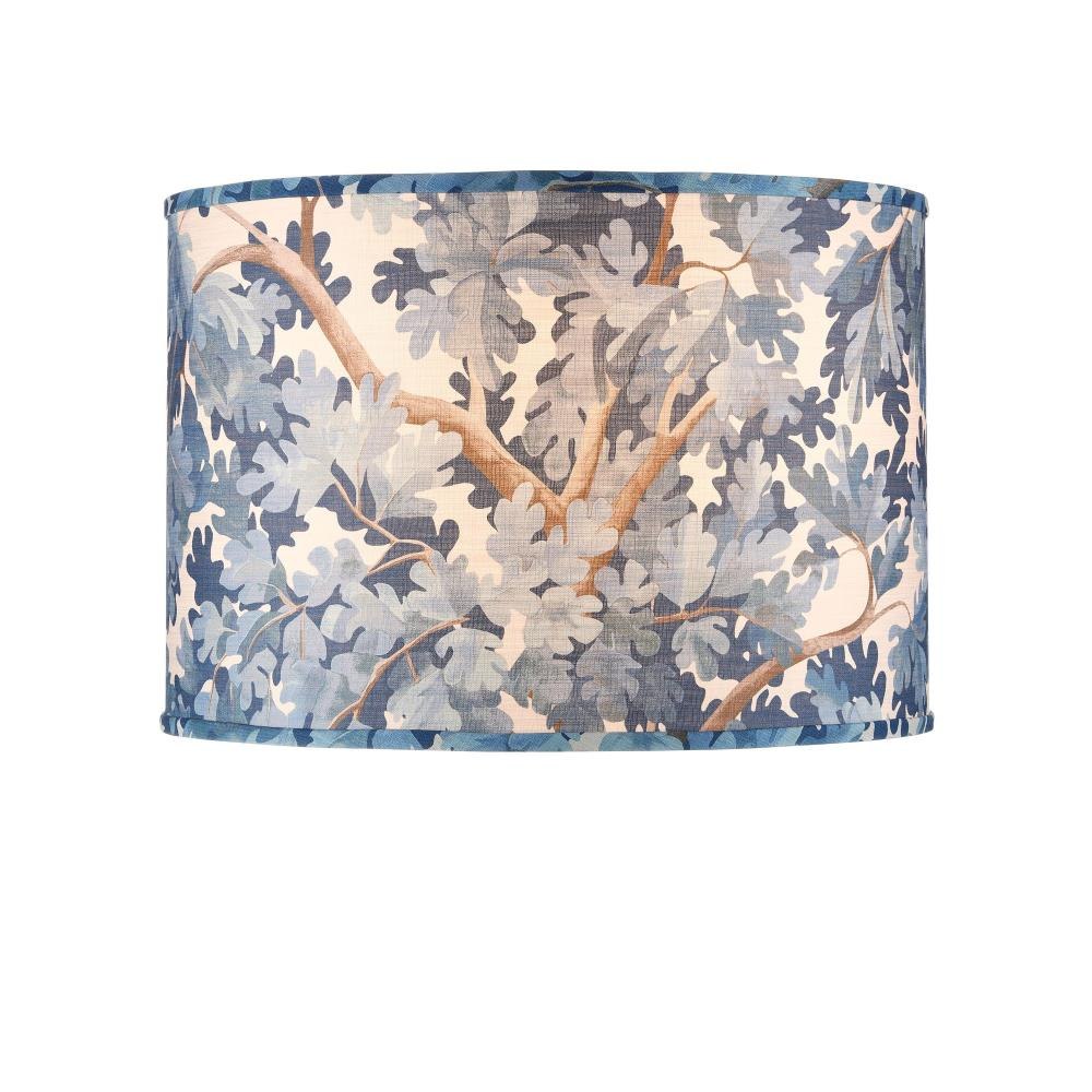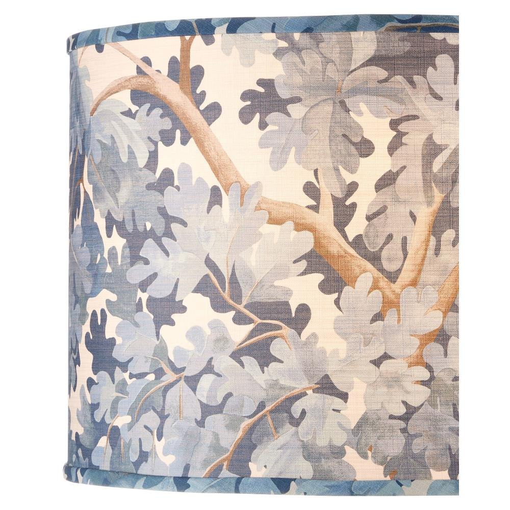 The leaves and branches of an oak tree wrap the drum-shaped, blue fabric lampshade from design partner Lacefield Designs.