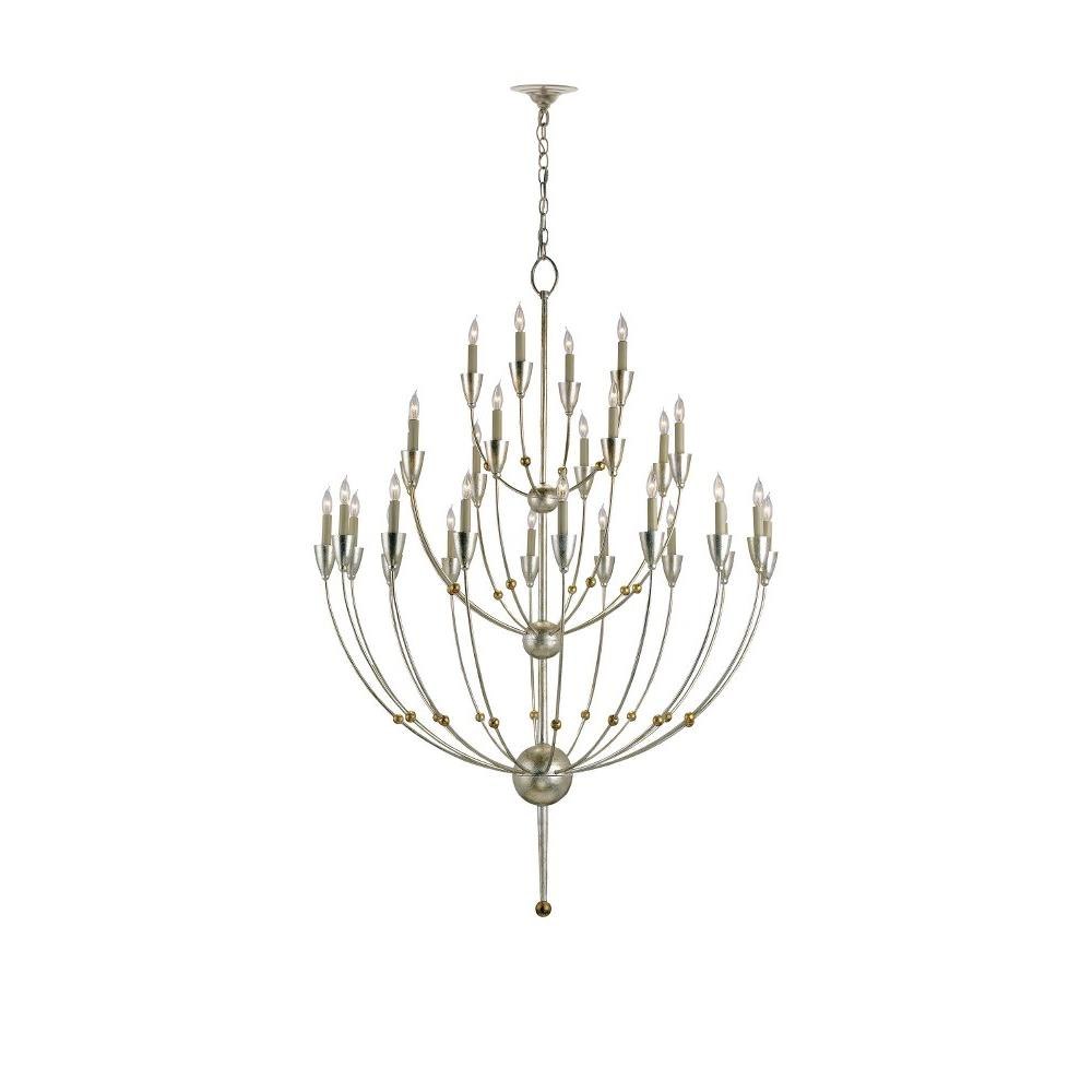 The Paradox Chandelier is a three-tiered silver chandelier with clusters of slender wrought iron arms reaching up toward wooden candle cups. The prevailing silver leaf finish brings this 28-light fixture a very modern feel, while the tiny gold-leaf globes that stud the arms bring a contrasting warmth.