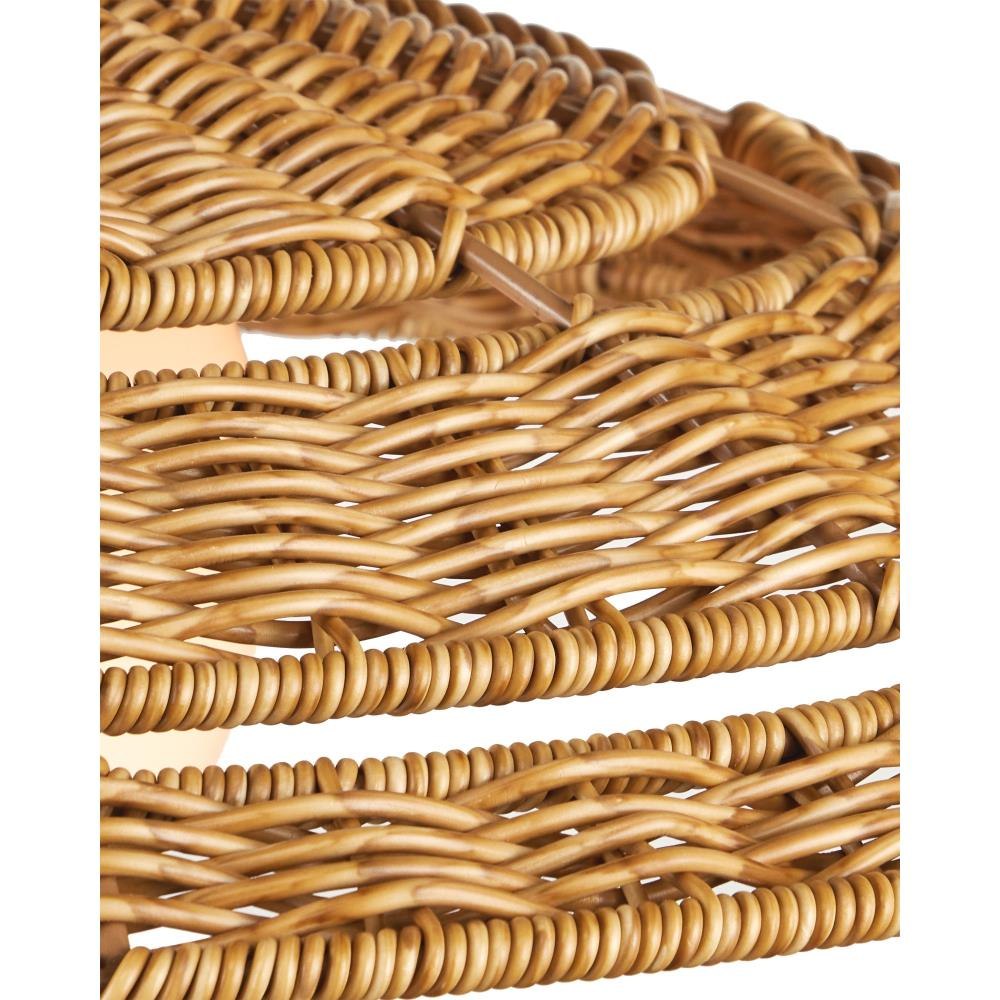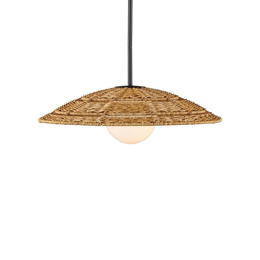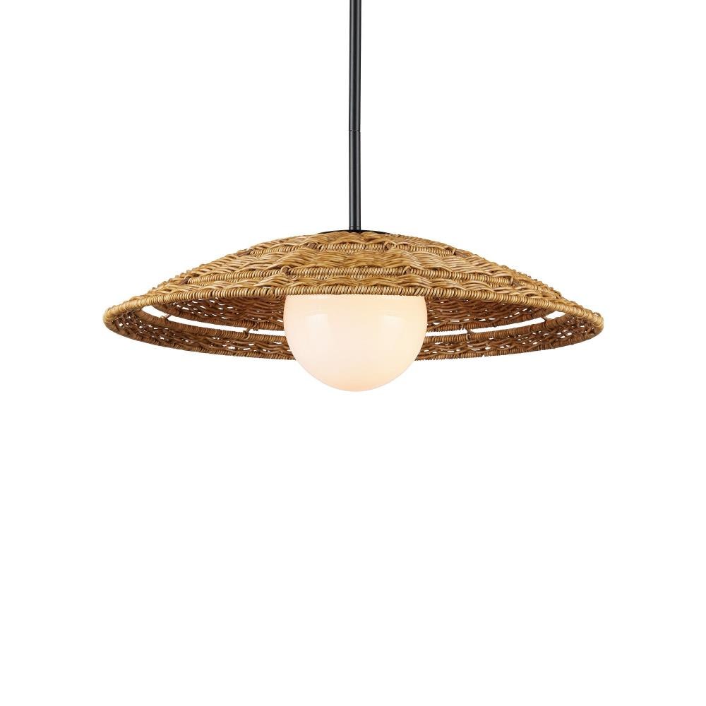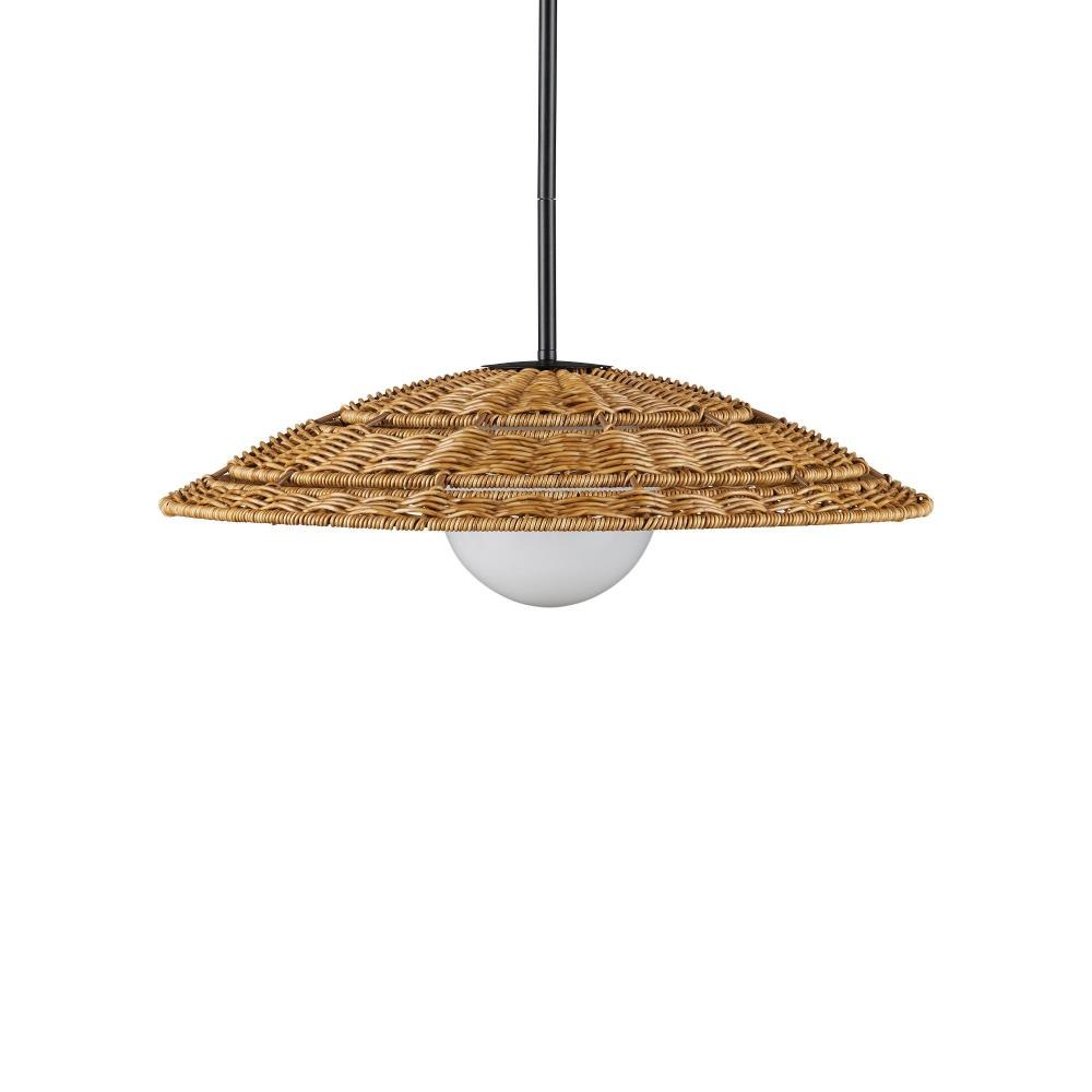 The Barbary Small Outdoor Pendant features an inverted bowl-shaped shade woven by hand from durable, all-weather synthetic wicker in a warm tan tone. The tight, uniform weave showcases artisanal craftsmanship and surrounds a central circular cut-out that reveals a glowing milk-glass globe. Suspended from a black powder-coated rod, this one-light pendant is wet-location tested, making it a stylish and reliable choice for covered patios, porches, or outdoor entryways. Adjustable from 12.5" to 54.5" with use of included chain/rod kit/cable. If your space calls for a longer drop, additional chain/rods/cable is available for purchase.