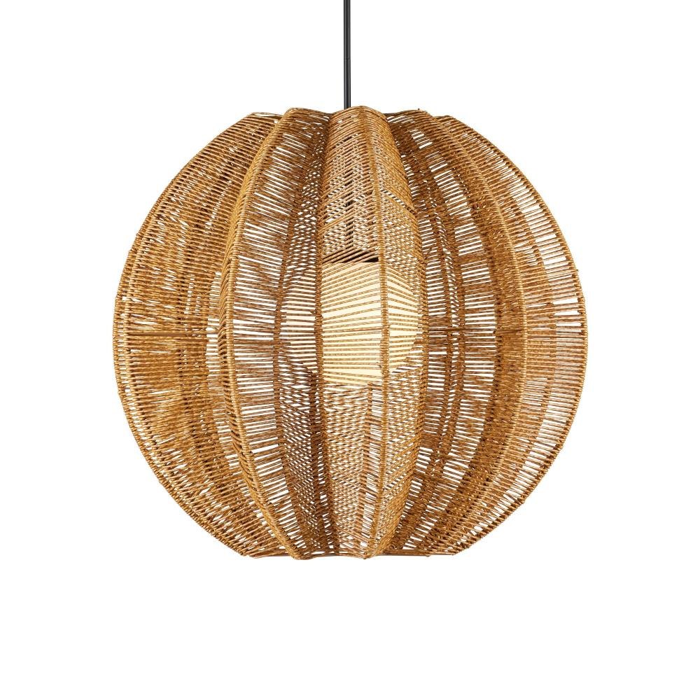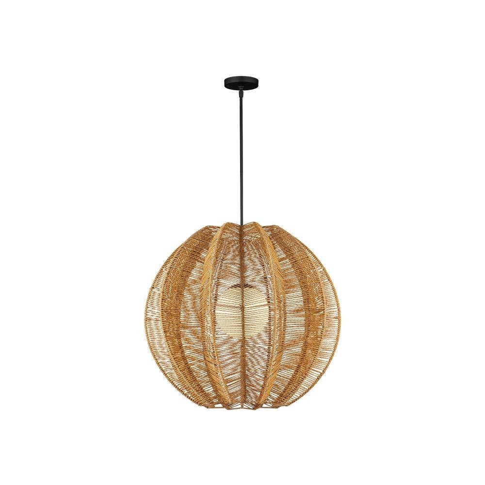 The Barbary Fluted Outdoor Pendant showcases a distinctive starfruit-inspired silhouette, hand-tied from all-weather synthetic wicker in a warm tan tone. The meticulous weave forms a sculptural shape that surrounds a milk-glass globe, which diffuses the light and casts subtle, textural shadows. Suspended from a rod in a black powder-coated finish, this one-light fixture is wet-location tested, making it both a durable and artful choice for outdoor settings. Adjustable from 36" to 78" with use of included chain/rod kit/cable. If your space calls for a longer drop, additional chain/rods/cable is available for purchase.