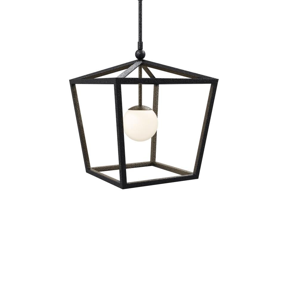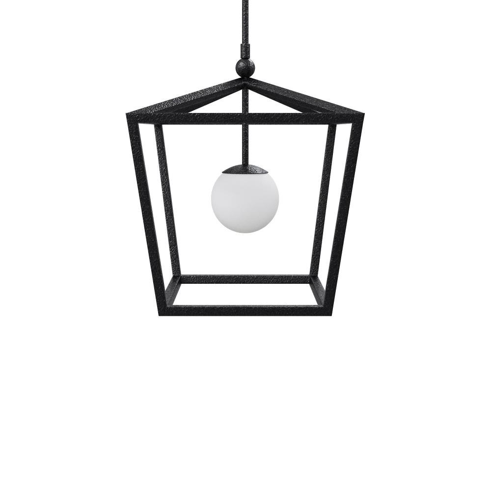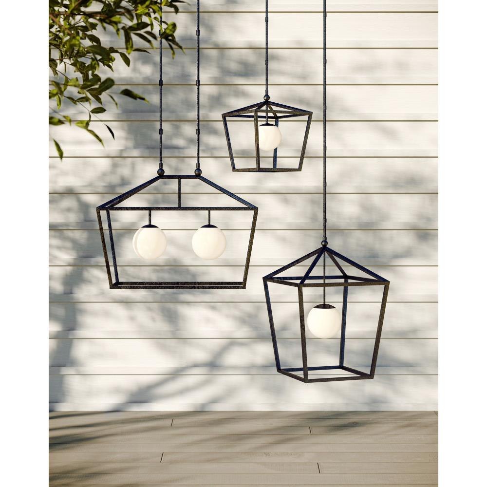 The Denison Medium Black Outdoor Lantern features a clean-lined wrought iron frame in a durable black powder-coated finish that brings subtle texture to the metal surface. One light is enclosed in a glass globe, casting a soft, diffused glow ideal for outdoor settings. Architectural connecting rods suspend the lantern, adding a refined structural element to the design. Wet-location tested, this fixture combines form and function for porches, patios, or covered entryways. Adjustable from 26.5" to 68.5" with use of included chain/rod kit/cable. If your space calls for a longer drop, additional chain/rods/cable is available for purchase.