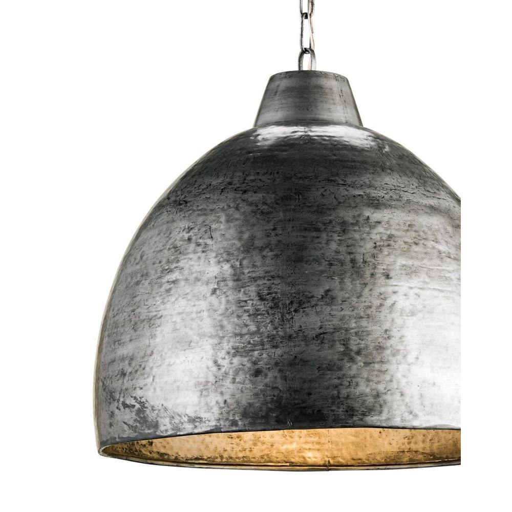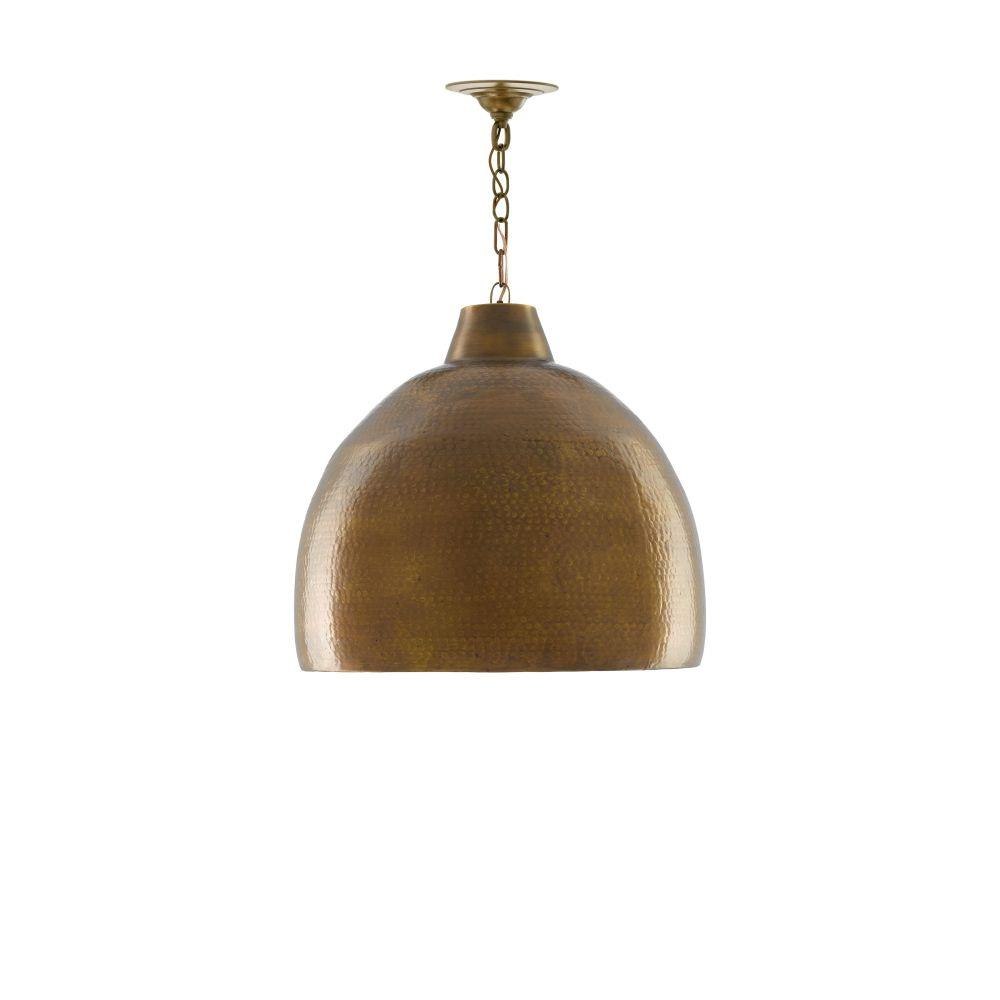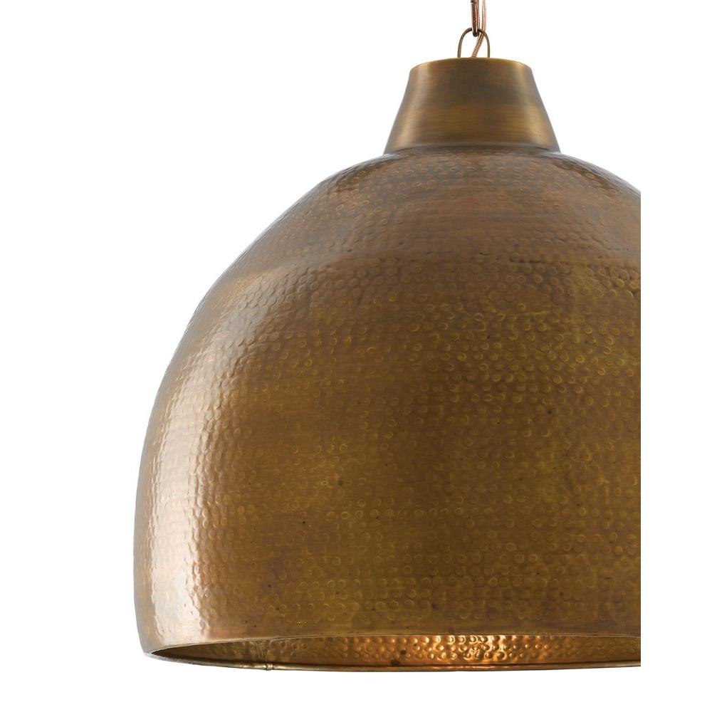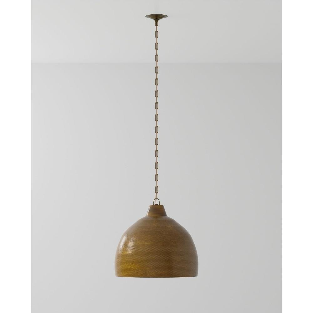 The Earthshine Brass Large Pendant has a hammered dome shape for a cool industrial look. Made of iron in a vintage brass finish, this sturdy gold pendant has a luminous glow on the interior. We offer this fixture, one of the rough luxe pendants in our lineup, in small and large steel pendants.
