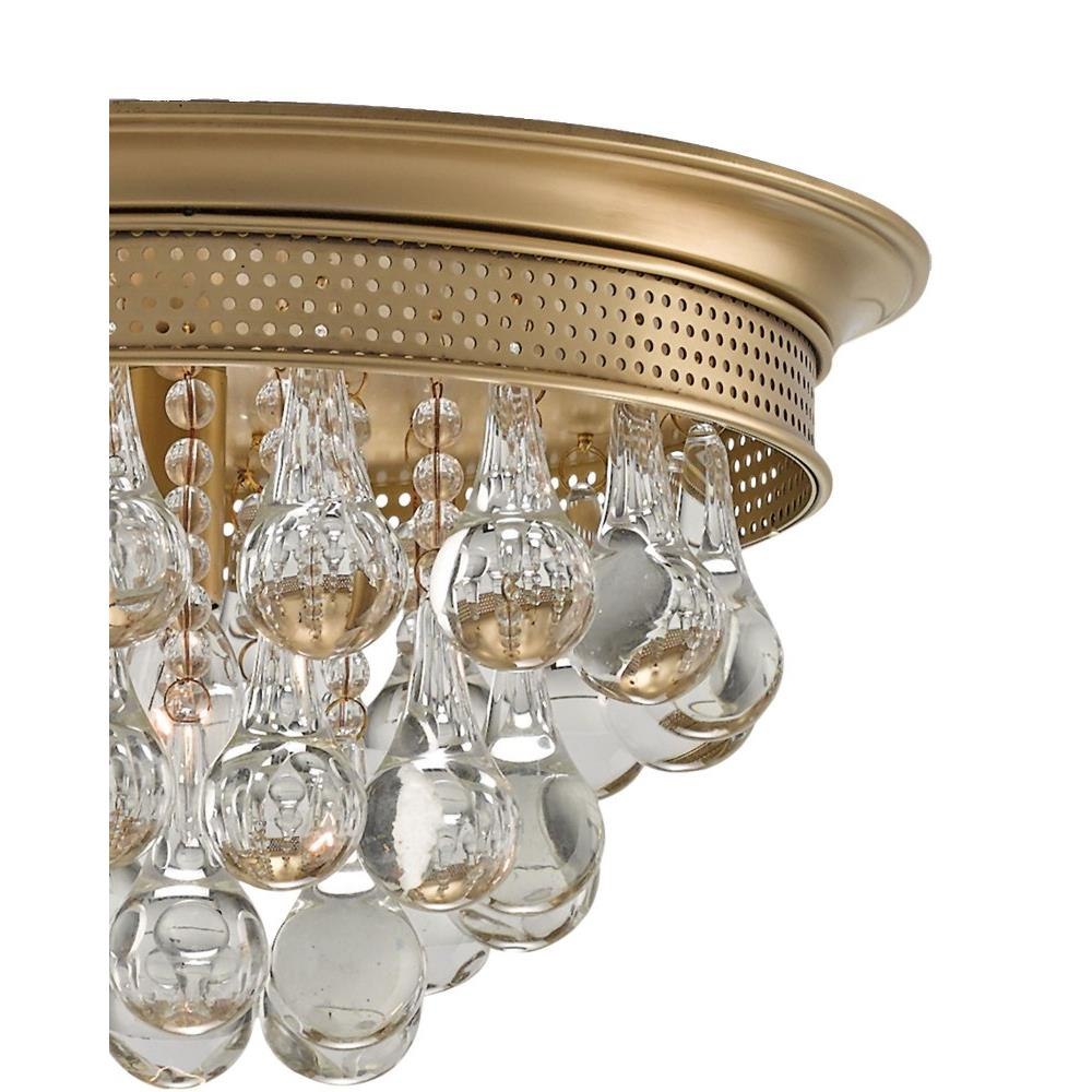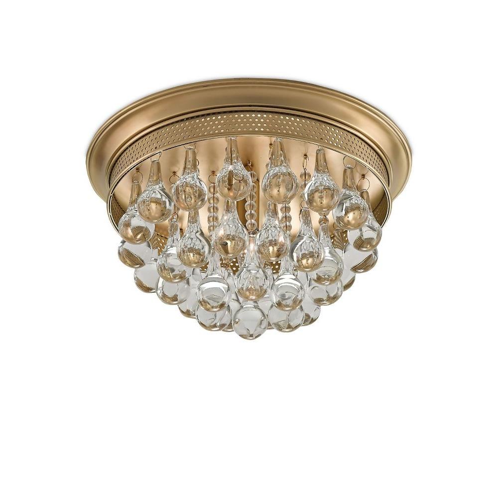 Crystal droplets rain down from the center of the Worthing Flush Mount. The opulence of the crystals contrast the perforated brass ceiling mount in an antique brass finish. The stylish juxtaposition of materials on this gold flush mount exudes both lightness and warmth.