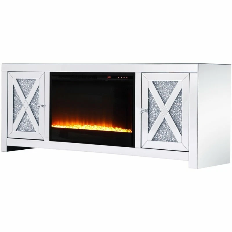 Elegant Decor Modern 2 Door 59" Clear Silver Mirrored Crystal Fireplace TV Stand