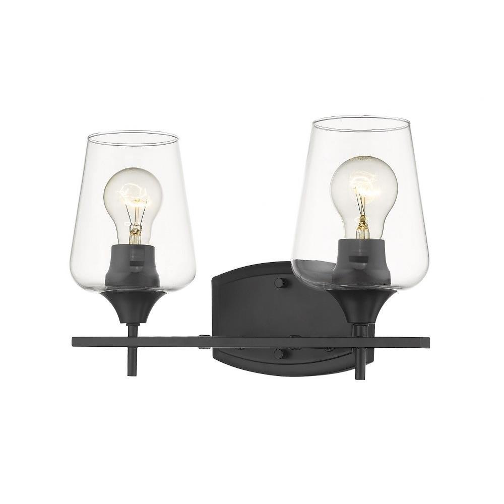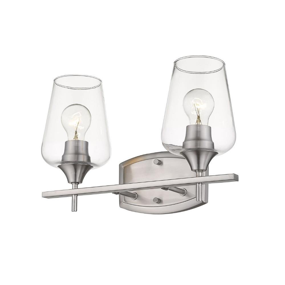 Upscale sophistication with a Mid Century Modern vibe tells the story of this elegant two-light vanity light. A blend of delightful materials offers stunning large glass shades with Brushed Nickel finish metal, delivering a versatile palette that embellishes the look of any transitional bath space.