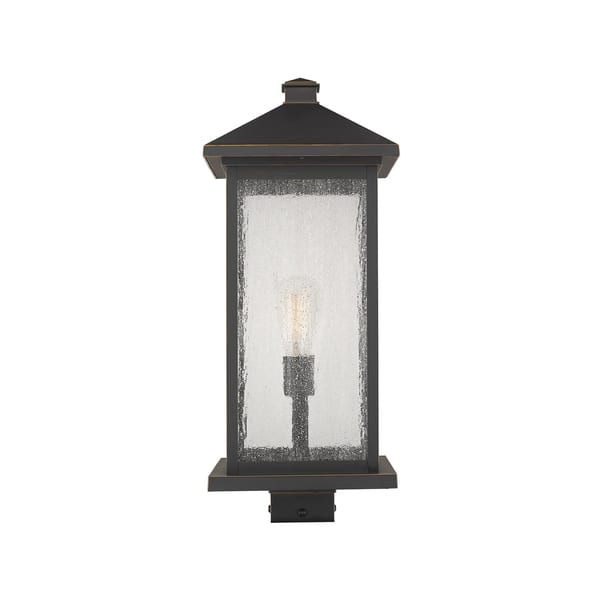 Rich details and sleek lines from this one-light post lantern offer a streamlined look to any outdoor space. Richly hued outdoor rubbed bronze combines with clear seeded glass to add dimension and radiance.