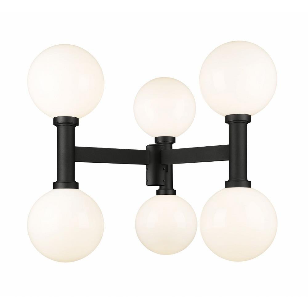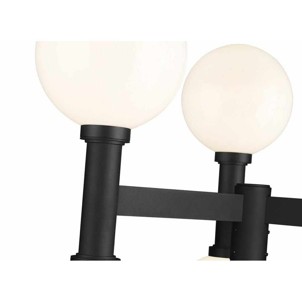 Artistry goes whimsical with a Mid-Century Modern vibe, adding a ton of charm to an exterior space. From the Copper Beech Crest collection comes a six-light outdoor post-mount fixture offering a retro-influenced motif and a dose of Art Deco attitude. Dressed up with six opal white glass globe shades and cylindrical black finish aluminum elements, this post mount fixture delivers eye-catching palette contrast.