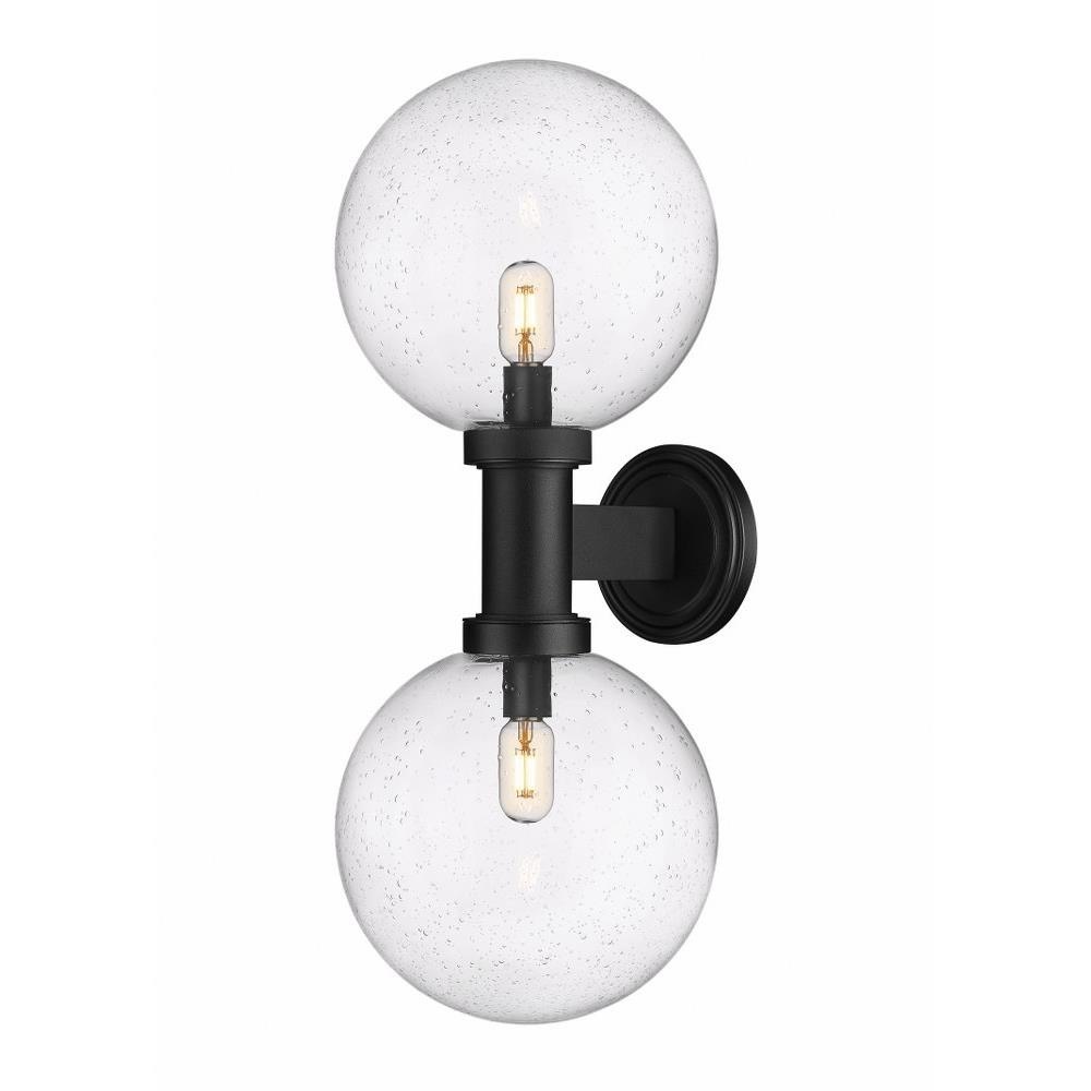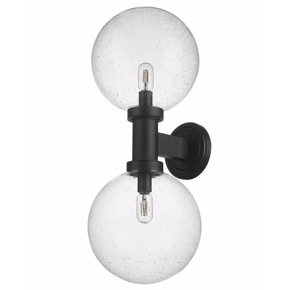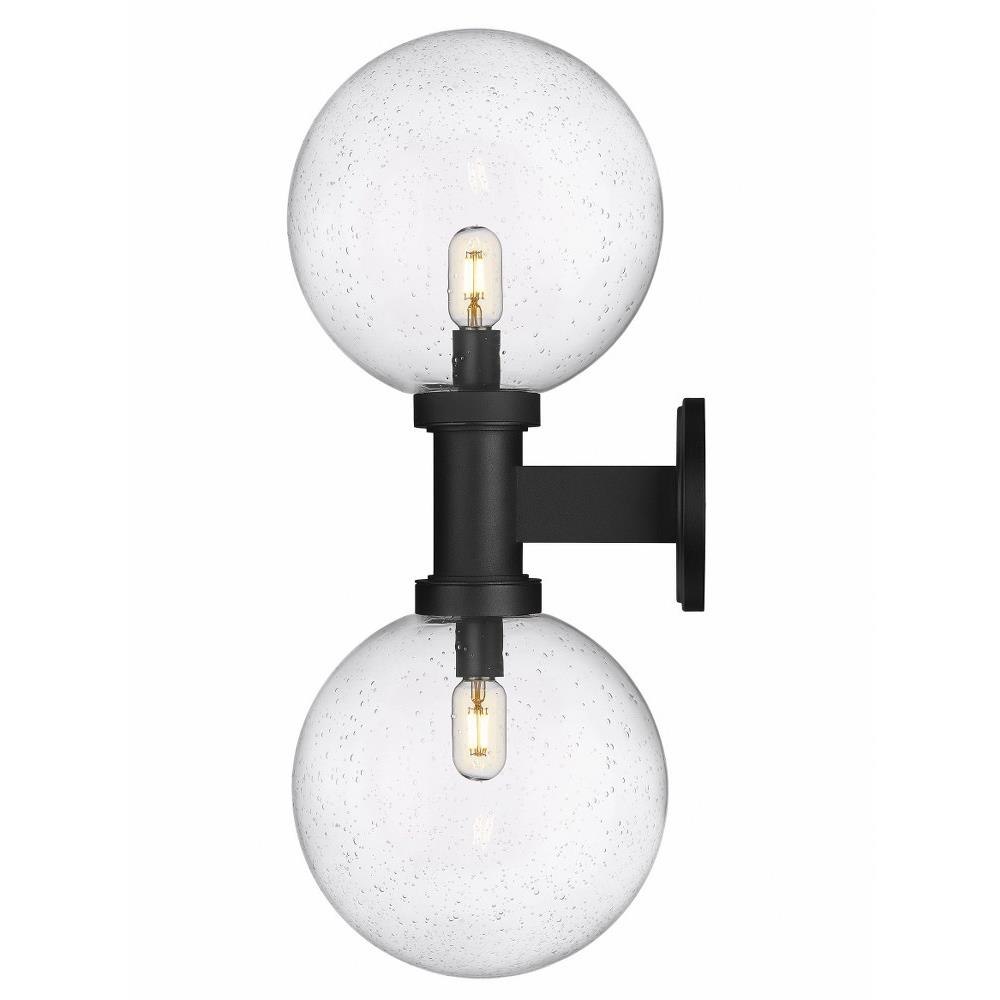 Chic elegance follows a dose of Mid-Century Modern vibes when this charming exterior light fixture elevates sophistication on a residential structure or deck space. From the Copper Beech Crest collection comes a two-light outdoor wall sconce with a linear and circular blend of silhouetting. A simple yet tasteful black finish aluminum frame and wall plate hosts dual globe shades fashioned of delicate clear seedy glass.