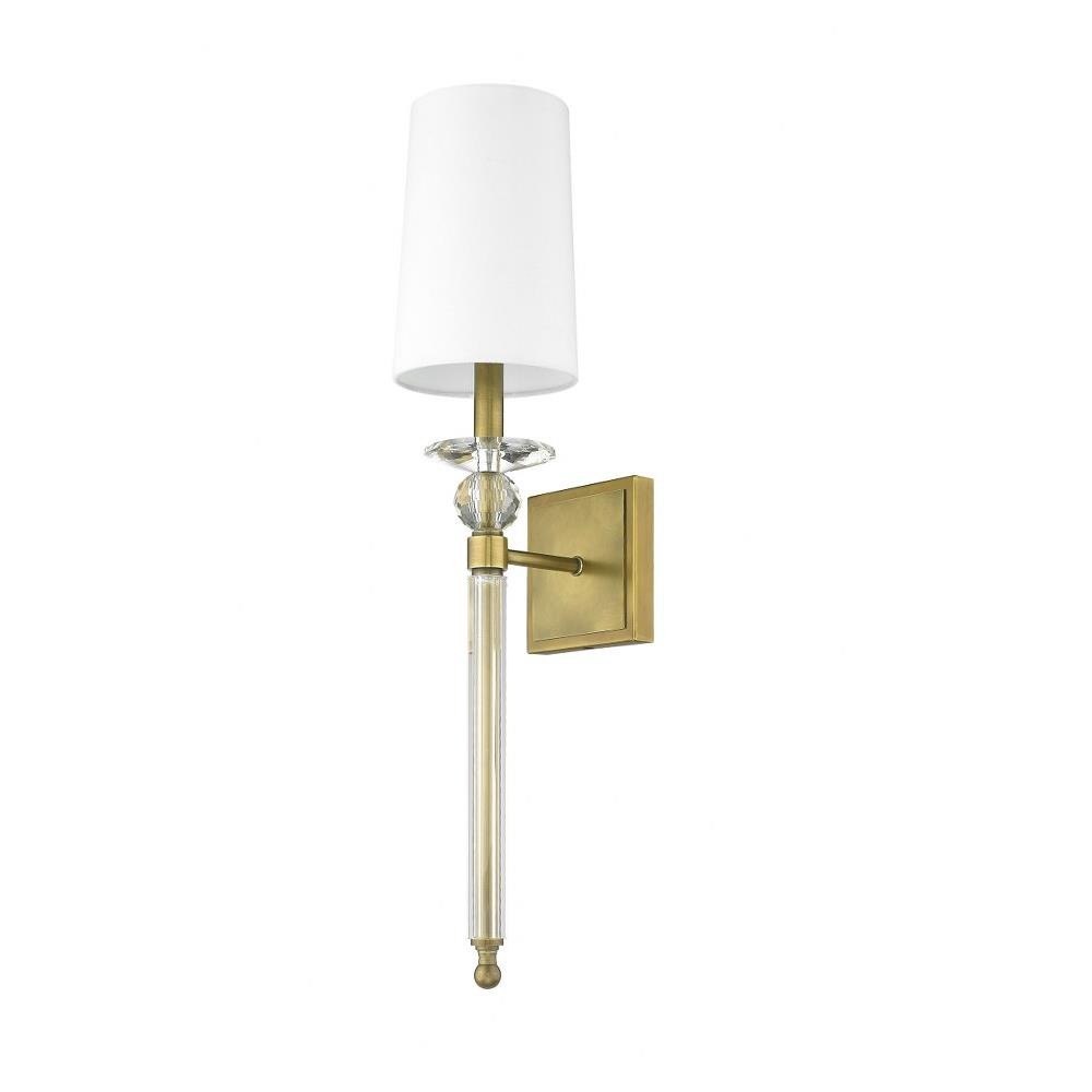 Capture the upscale elegance of a wall-mounted fixture that delivers ambient lighting as it updates the look of a bathroom, bedroom, or hallway. Made from rubbed brass finish steel and crystal, and topped with a sleek white fabric shade, this one-light wall sconce embellishes a classic design scheme with a traditional lamp motif and artistic crystal accents.