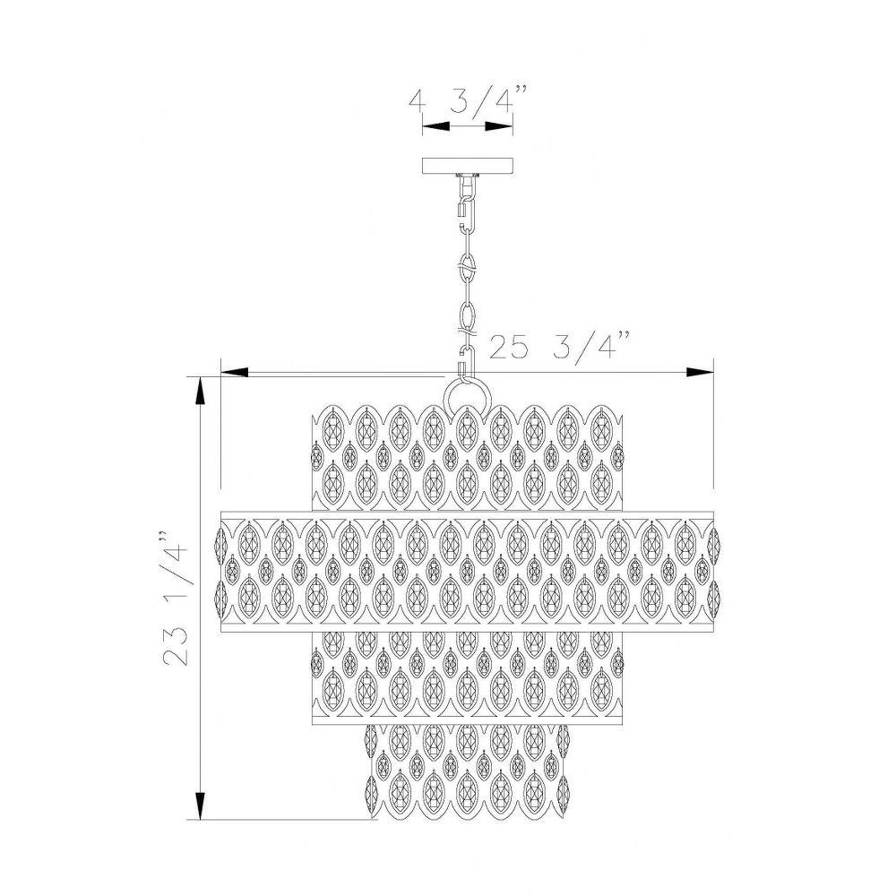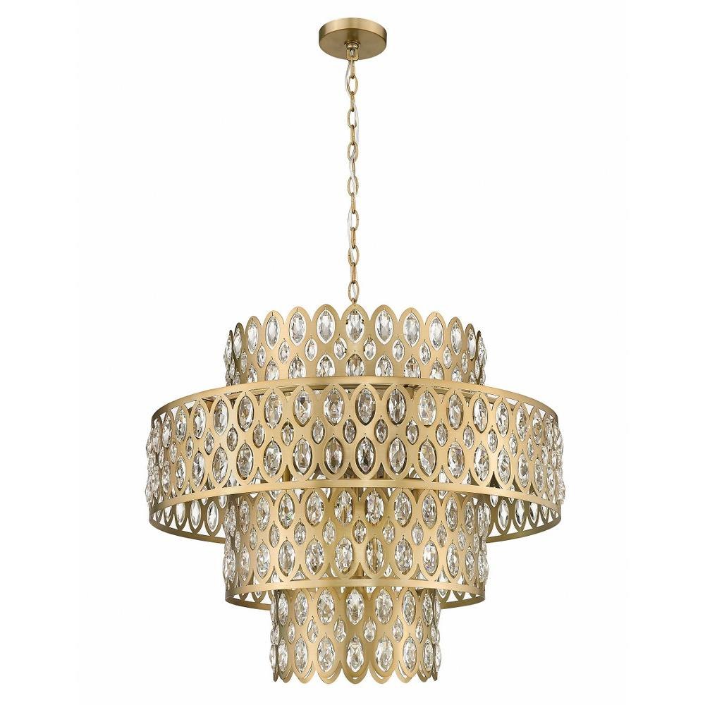 Layered drums create a tiered effect for the sparkling presentation of a modern glam 13-light pendant. Glittering oval crystals fill cut outs in each of the four drums with sophisticated ambiance, creating a rich and elegant look that blends beautifully in elegant living spaces. From the Partridge Grove collection, this pendant offers a warm heirloom brass finish for a welcoming touch over a staircase or in a foyer.